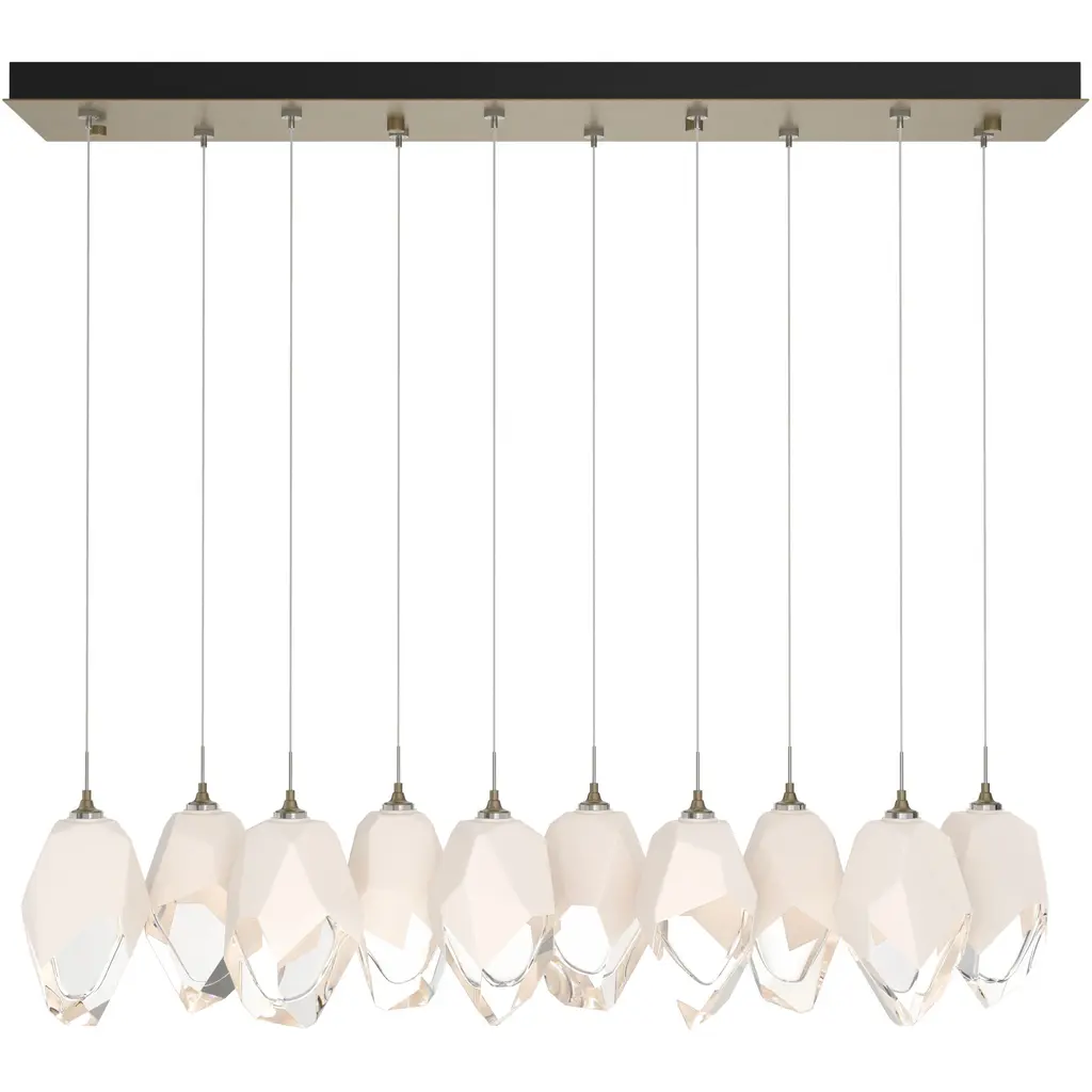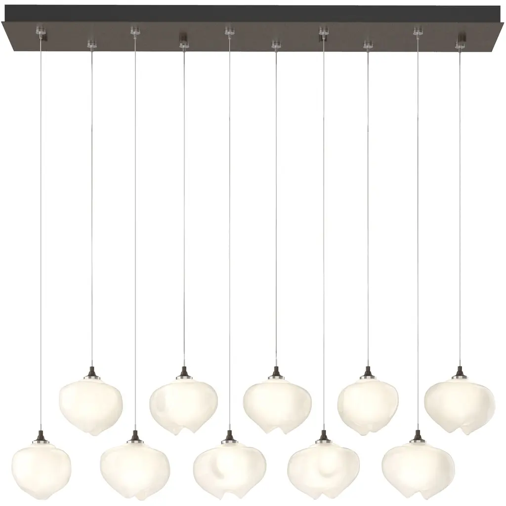 The Ume 10-Light linear fixture offers the exclusive Ume glass shade that is glossy on the outside, yet frosted on the inside, in a shape reminiscent of the Japanese blossoming plum for which it is named. Pendant heights can be easily customized by aligning or staggering each at the desired length from the rectangular canopy above.