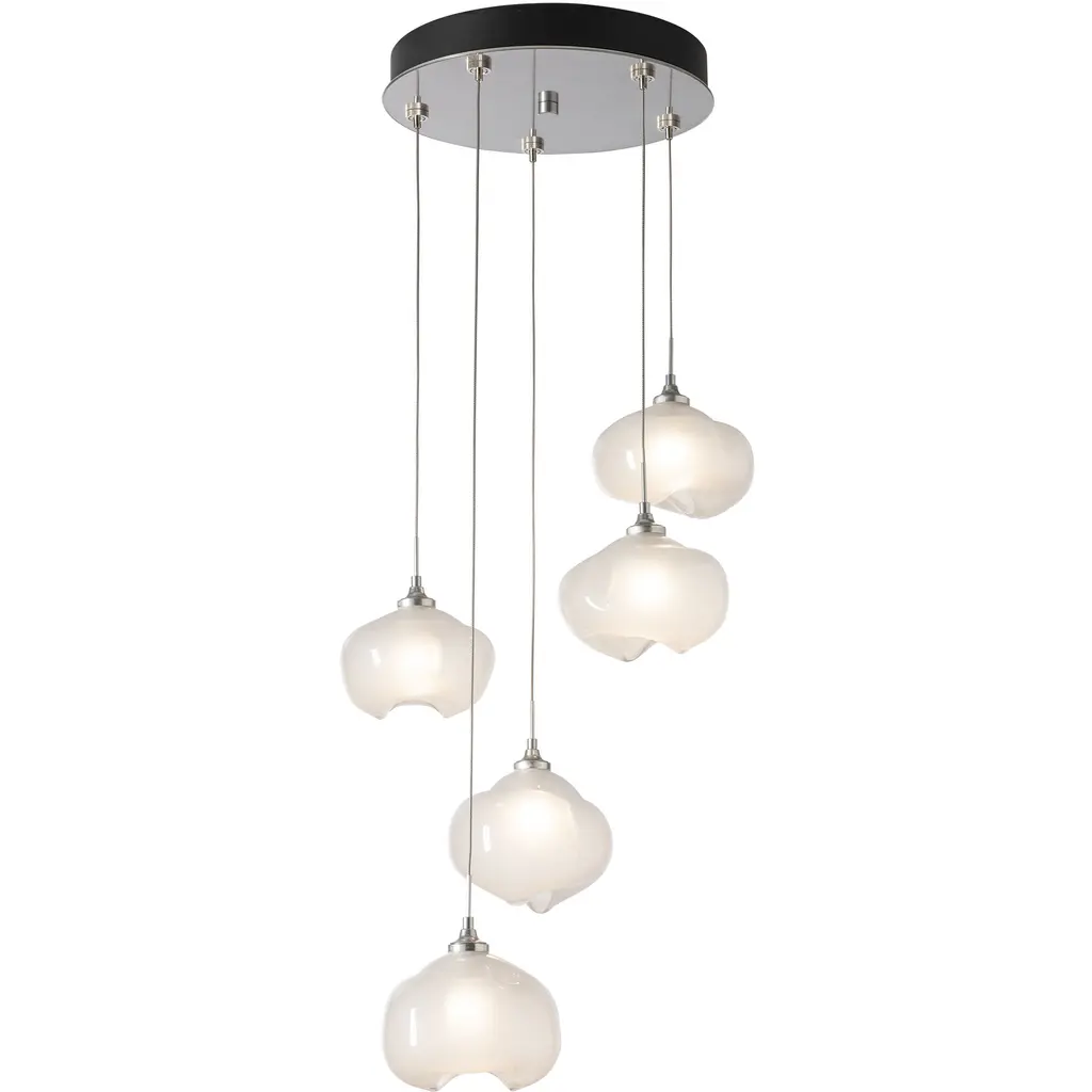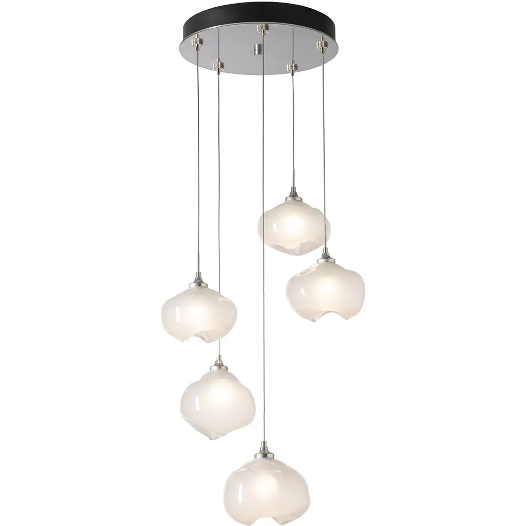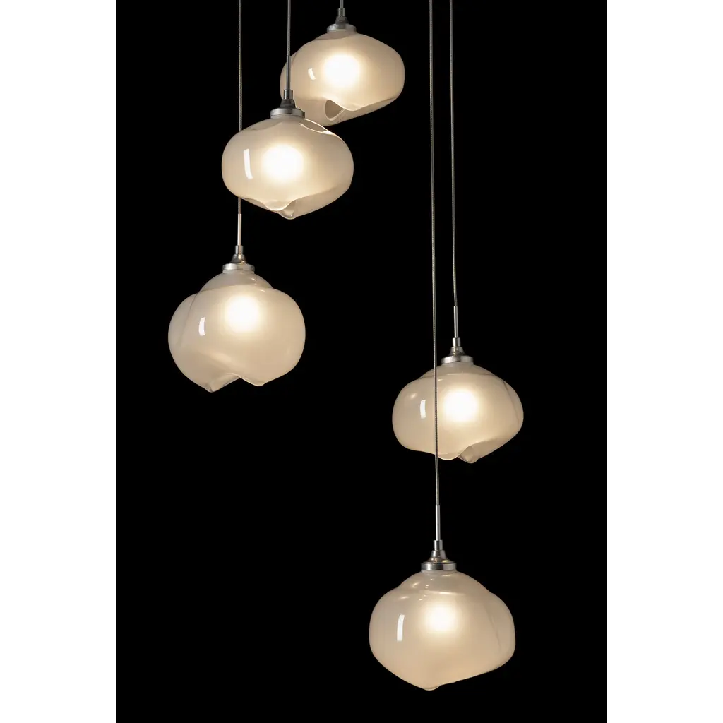 The Ume 5-Light is a multi-port fixture features the unique Ume frosted glass shades resembling the Japanese plum blossoms for which this collection is named. With the ability to customize the lengths of each cable, this versatile Ume fixture can serve as a semi-flush with shortened cables, or as a pendant with staggered individual lights.