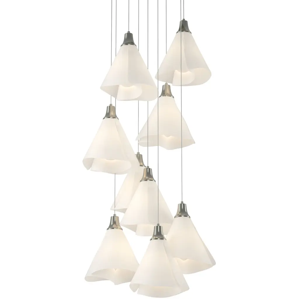 The Ume 9-Light multi-port fixture is offered with the choice of the unique Ume frosted glass resembling the Japanese plum blossoms for which this collection is named. The ability to customize the staggered lengths of each light allows the Ume to perfectly adapt to fit its space.