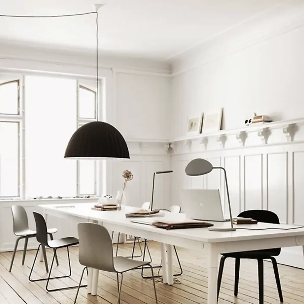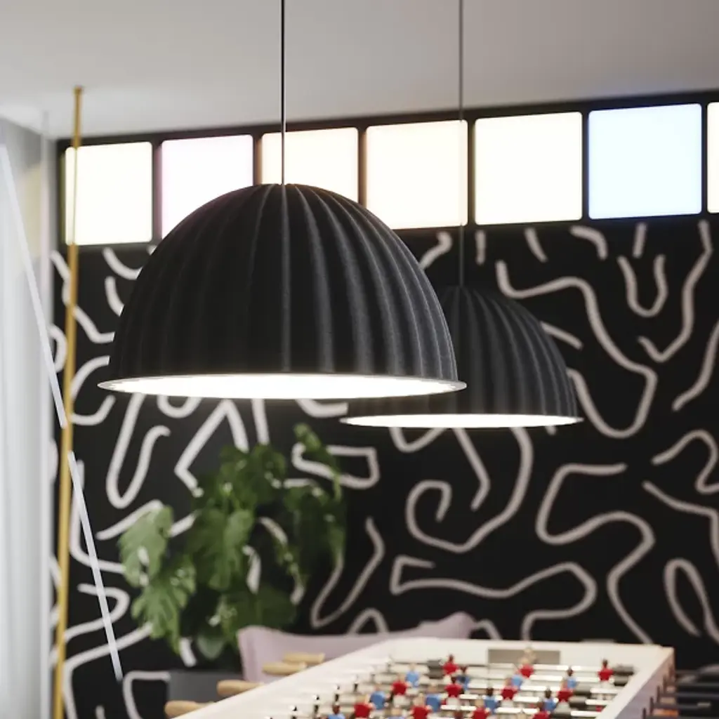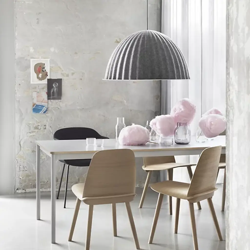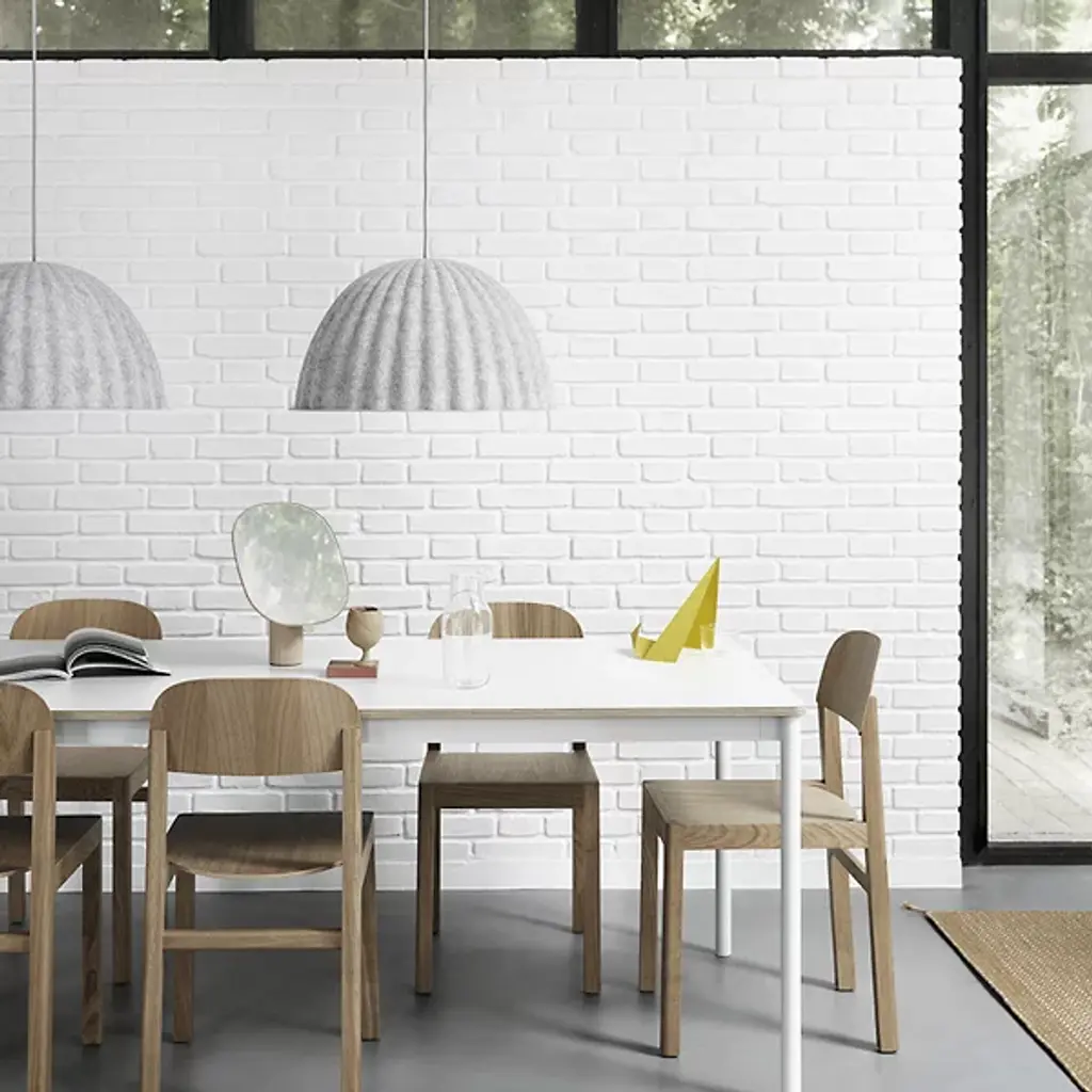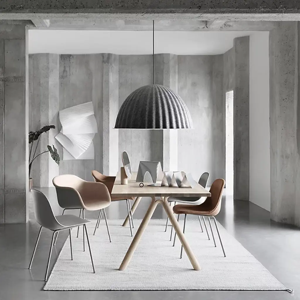 A deceptively complex pendant that, through its innovative design, creates an environment of warmly diffused light and controlled acoustics. The Muuto Under The Bell Pendant is made of recycled PET polymer felt and is shaped in such a way that both light and sound are focused on the table and people beneath it, embracing human interaction in both a physical and abstract sense.