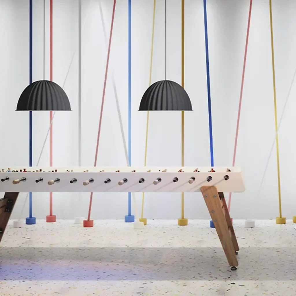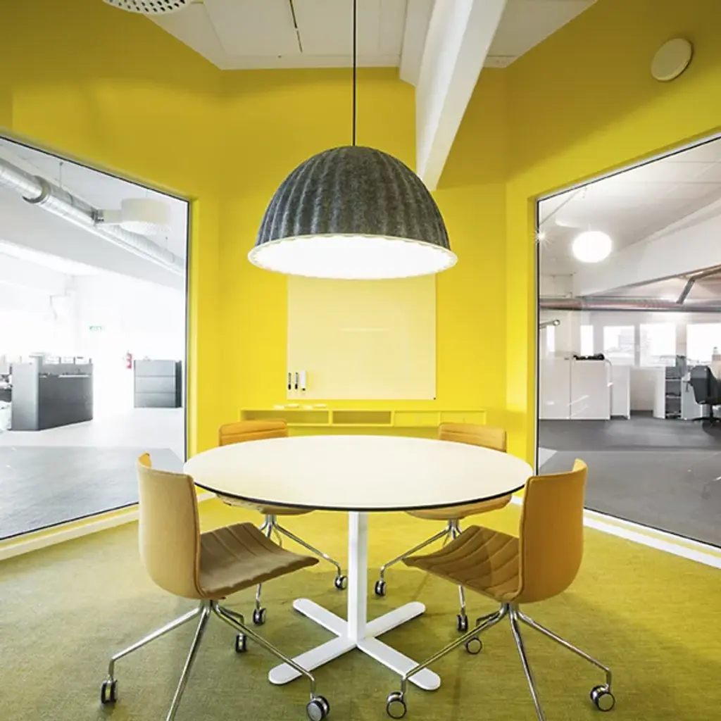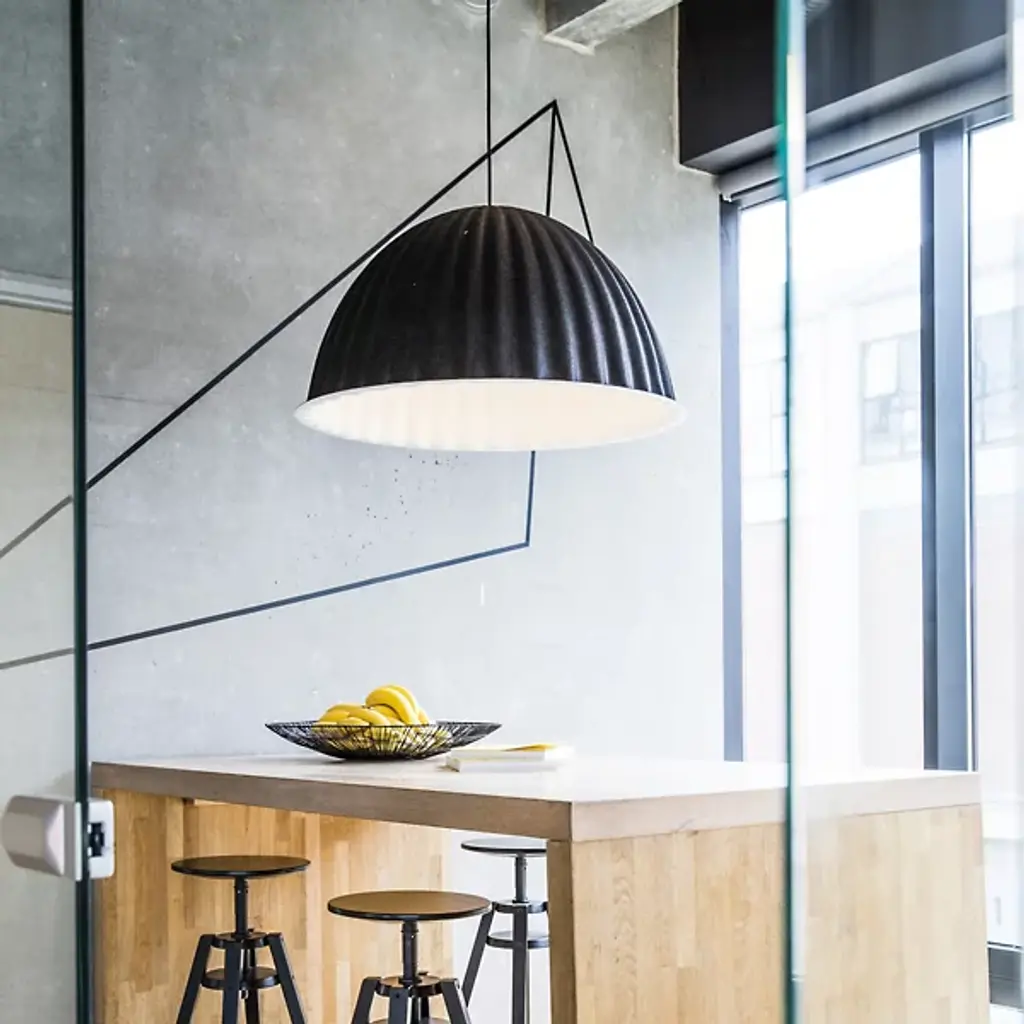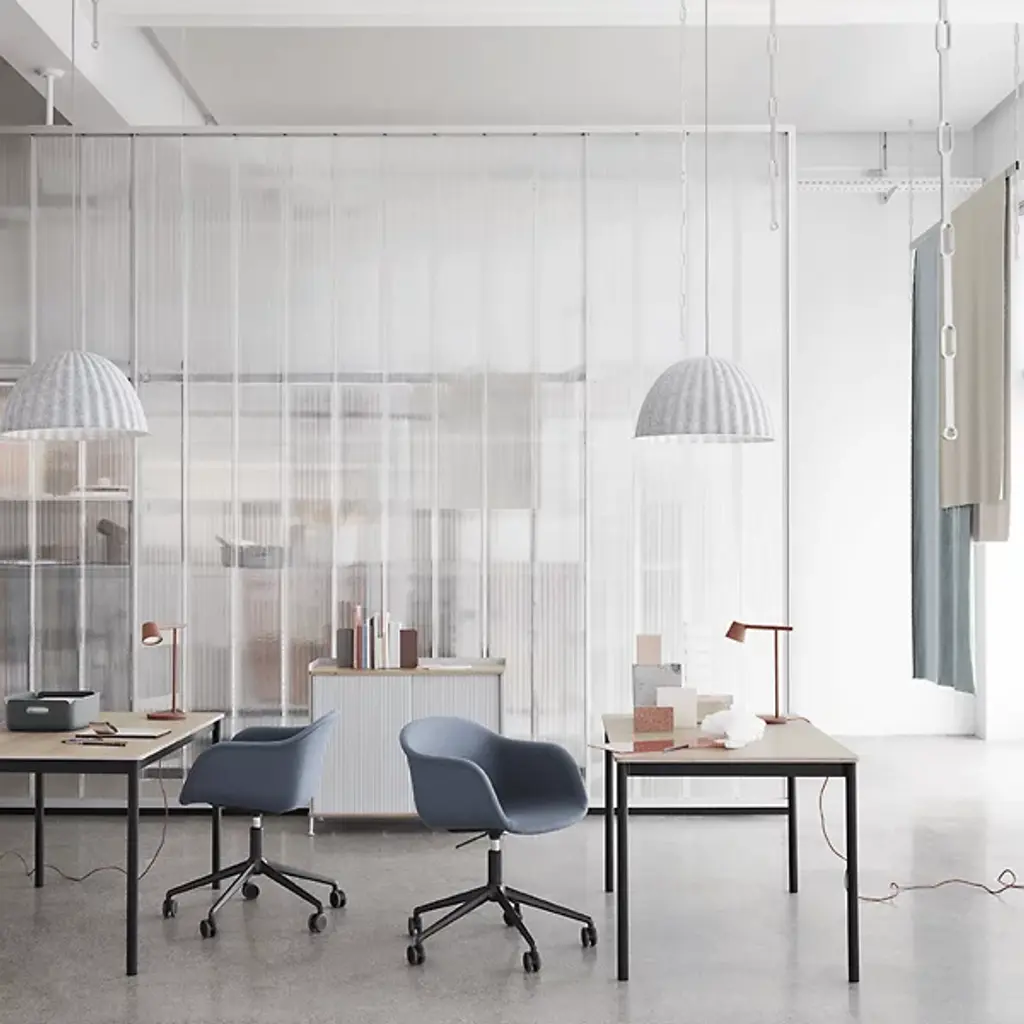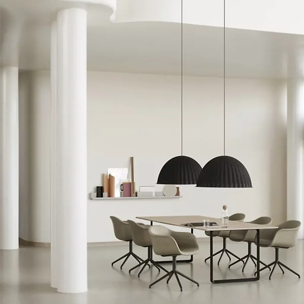 A deceptively complex pendant that, through its innovative design, creates an environment of warmly diffused light and controlled acoustics. The Muuto Under The Bell Pendant is made of recycled PET polymer felt and is shaped in such a way that both light and sound are focused on the table and people beneath it, embracing human interaction in both a physical and abstract sense.