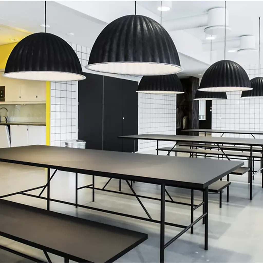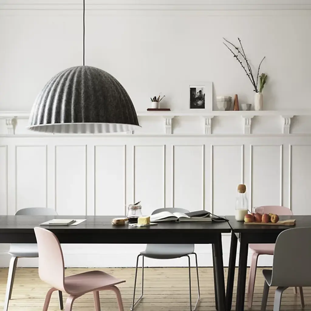 A deceptively complex pendant that, through its innovative design, creates an environment of warmly diffused light and controlled acoustics. The Muuto Under The Bell Pendant is made of recycled PET polymer felt and is shaped in such a way that both light and sound are focused on the table and people beneath it, embracing human interaction in both a physical and abstract sense.