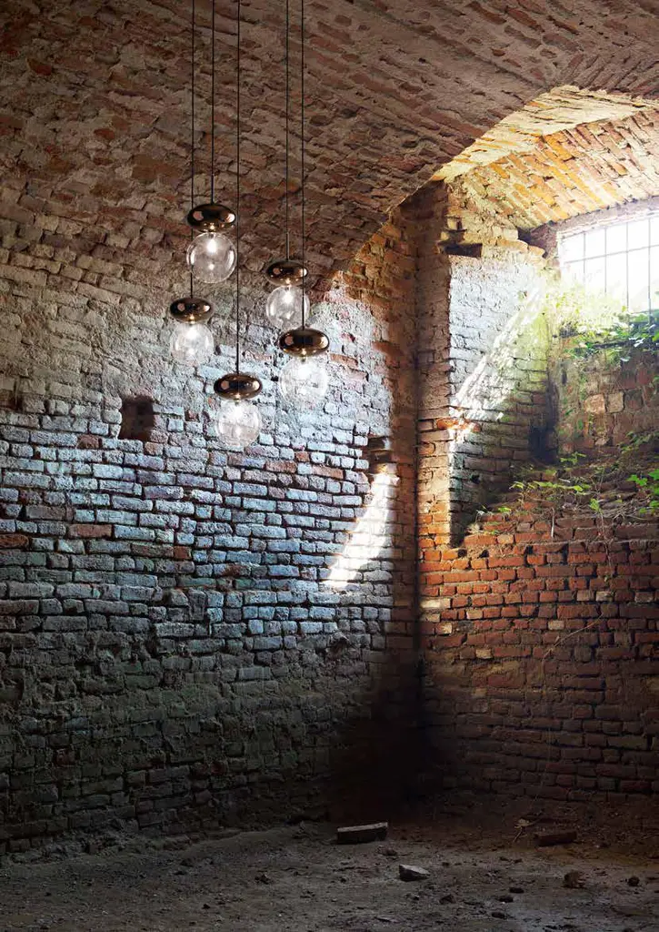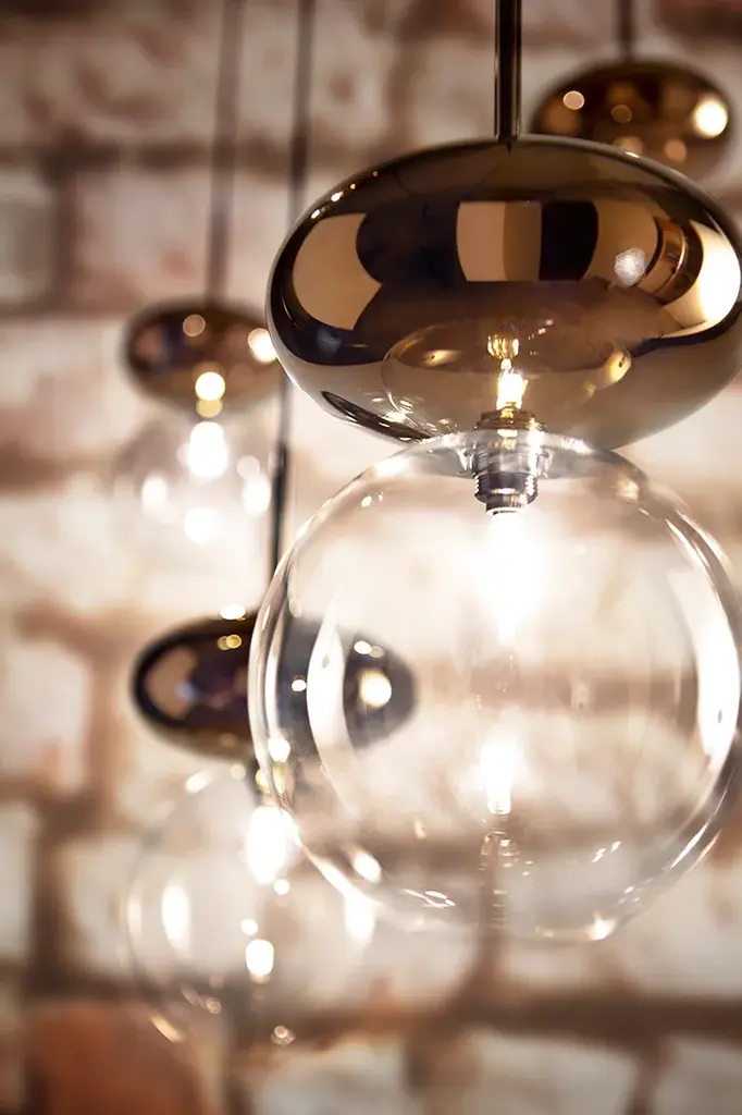 A spherical ampoule of transparent borosilicate glass and a reflective bronze elliptical come together in a perfect symbiosis that highlights their features through use of a light source.This extremely versatile and customisable lamp combines the beauty of a furnishing object with the charm of a lamp for a simple and striking result that allows its user to easily place it in any environment they choose.Ellipse in bronzed borosilicate, sphere in transparent borosilicate and glossy black chromed metal.The lamp is available in two versions:COMPOSITION1 12 - lights hanging lamp with 12 - lights canopy and decentralisers. Glossy black chrome.12 x G4 LED max 2W - 12V - 110 Lumen - 3000 KEnergy class from A to GBulb not includedCOMPOSITION3 4 - lights hanging lamp with canopy. Glossy black chrome. 5 x G4 LED max 2W - 12V - 110 Lumen - 3000 KEnergy class from A to GBulb not included