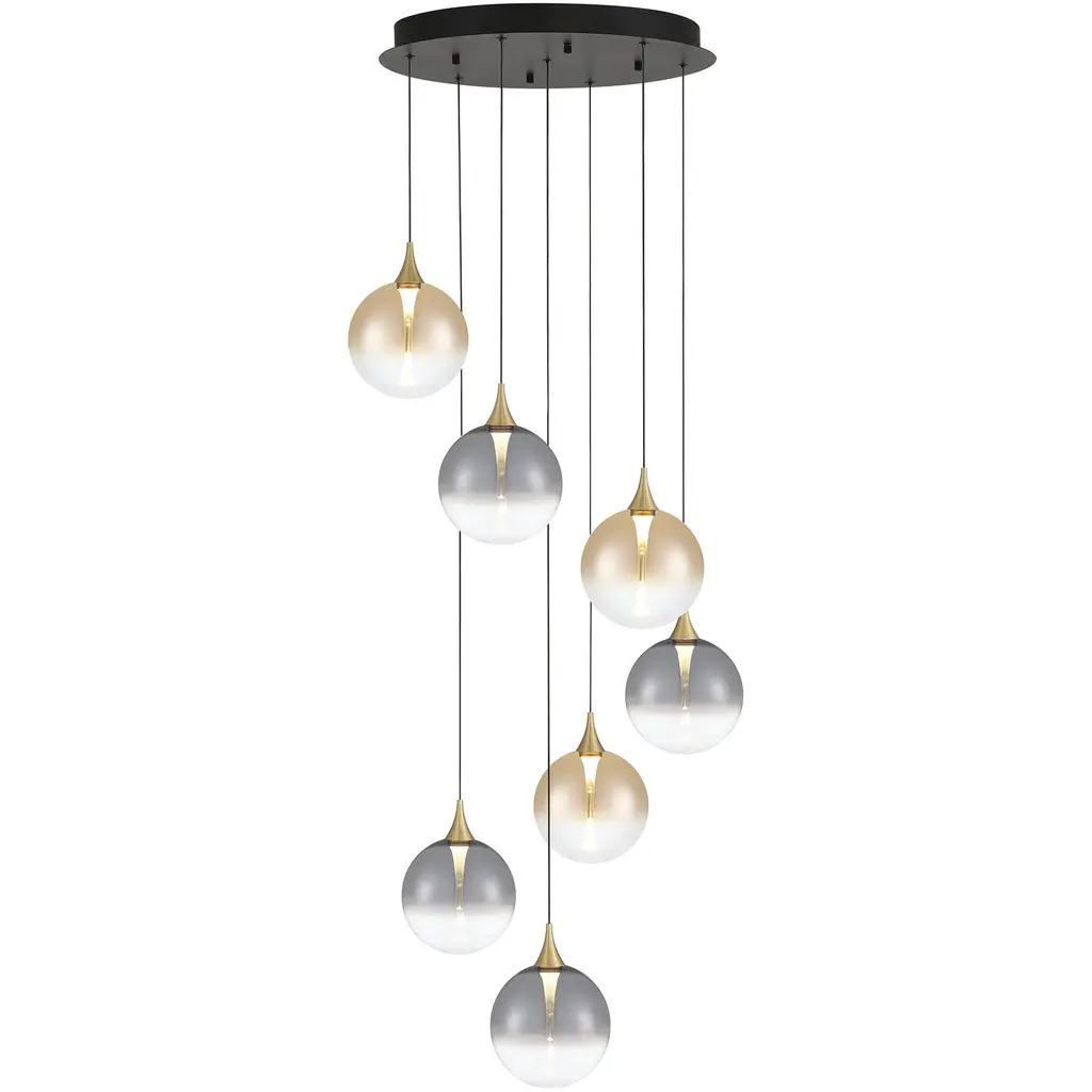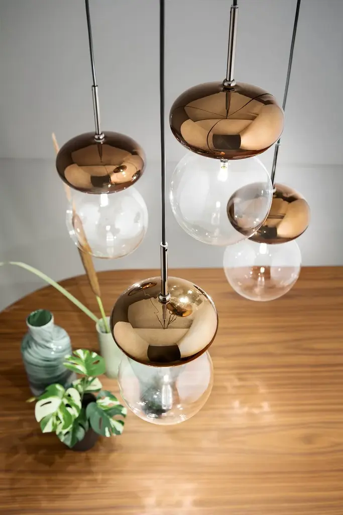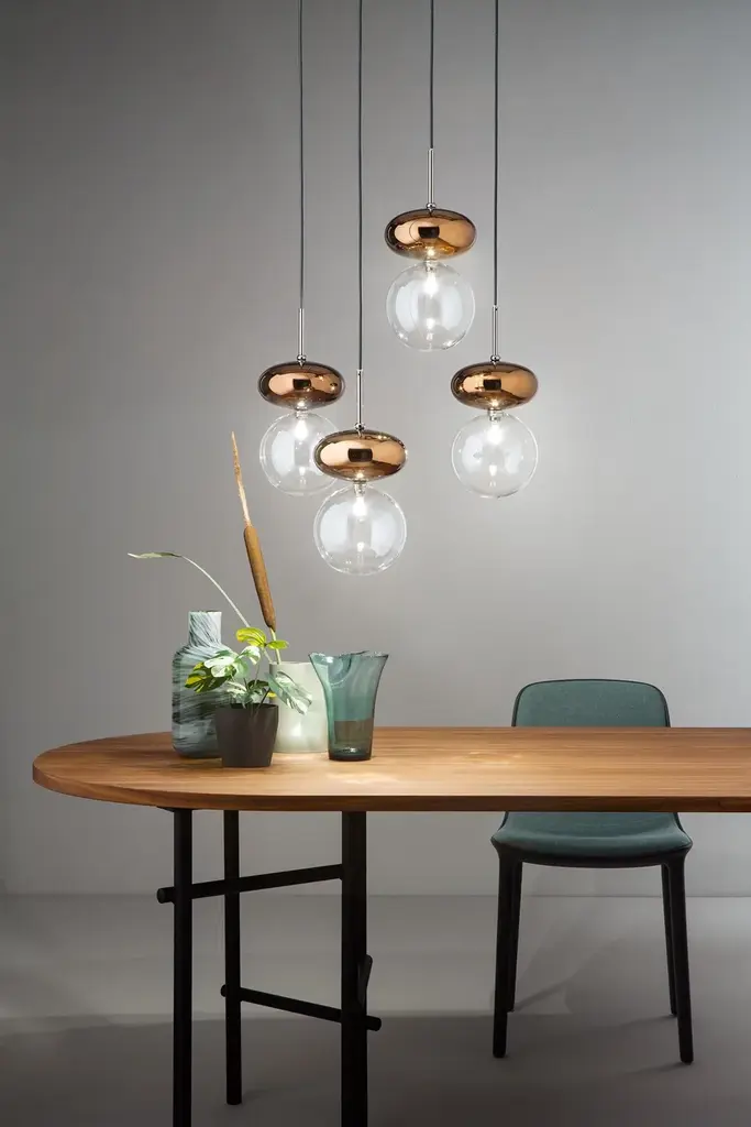 A spherical ampoule of transparent borosilicate glass and a reflective bronze elliptical come together in a perfect symbiosis that highlights their features through use of a light source.This extremely versatile and customisable lamp combines the beauty of a furnishing object with the charm of a lamp for a simple and striking result that allows its user to easily place it in any environment they choose. Single hanging lamp without canopy.G4 LED max 2W - 12V - 110 Lumen - 3000 KEnergy class from A to GBulb not included