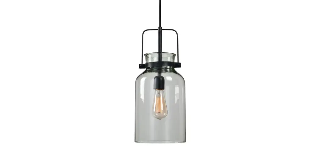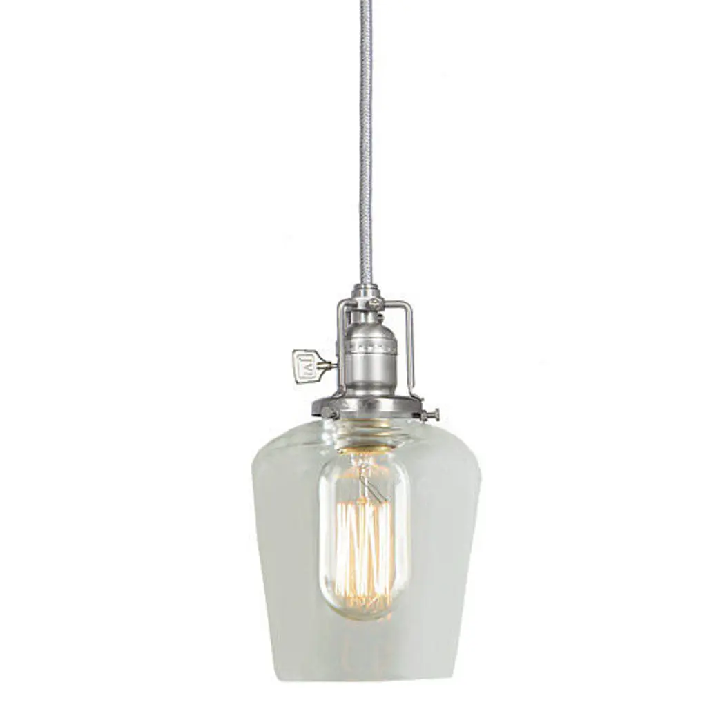 One light Union Square pendant gun metal finish 4" Wide, clear mouth blown glass shade