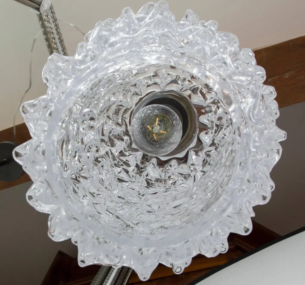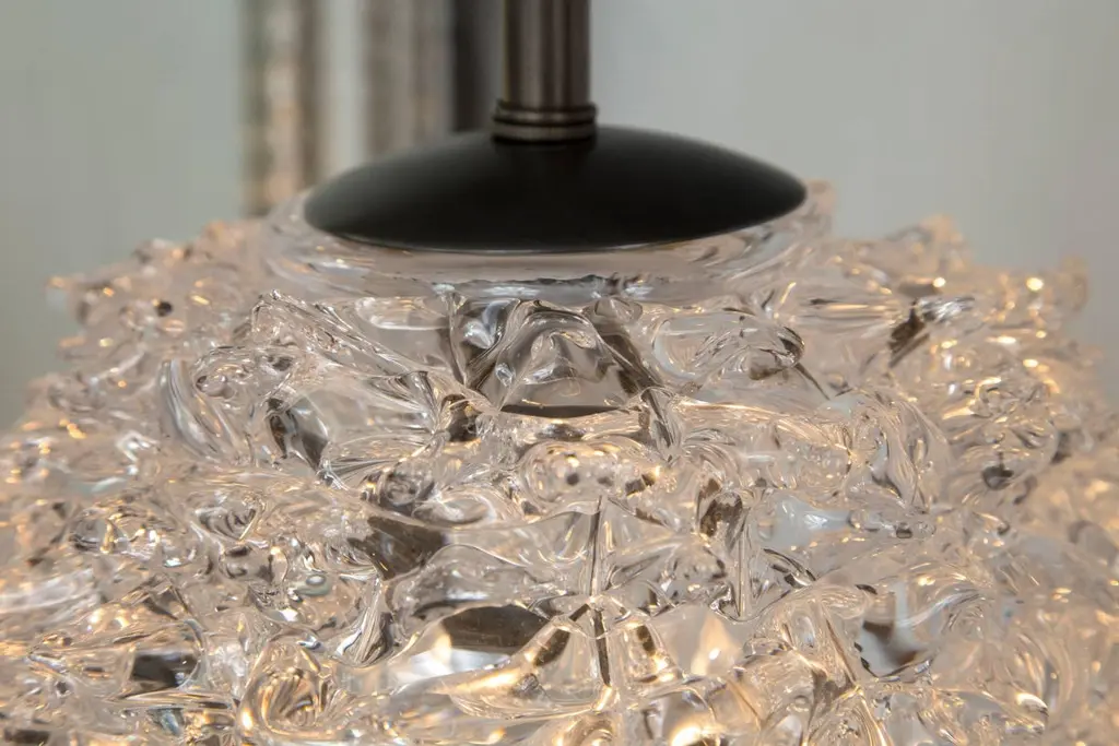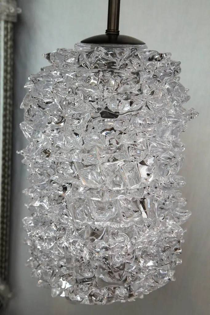 Unique and stunning over sized thickly blown ‘rostratro’ pendant, glass is 3″ thick of uneven texture, illuminated with one medium base socket in a darkened black finish on brass, weight of fixture 40lbsOrigin: Venice, ItalyDimensions of glass:12″ diameter14 1/2″ highOverall height with stem and canopy 45″ (this can be adjusted to desired height)