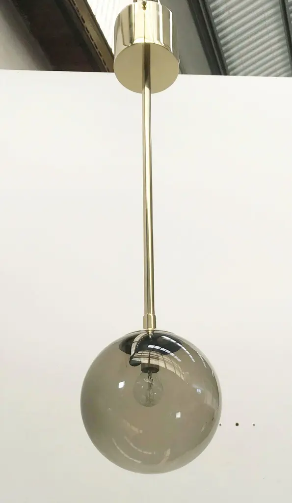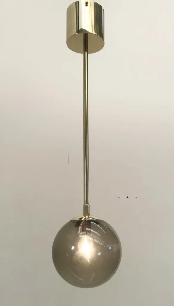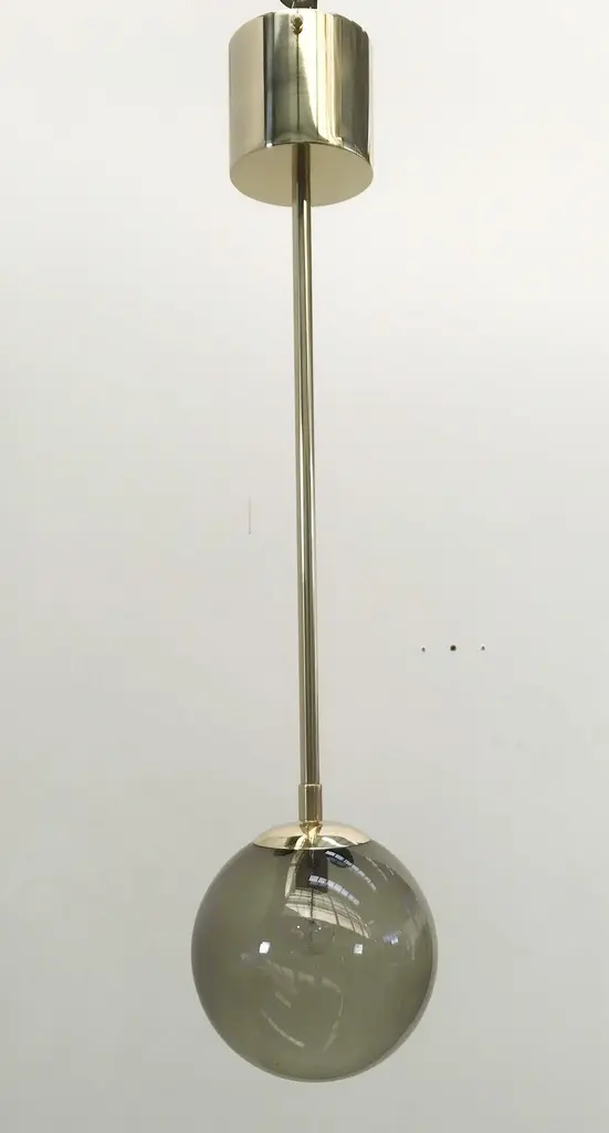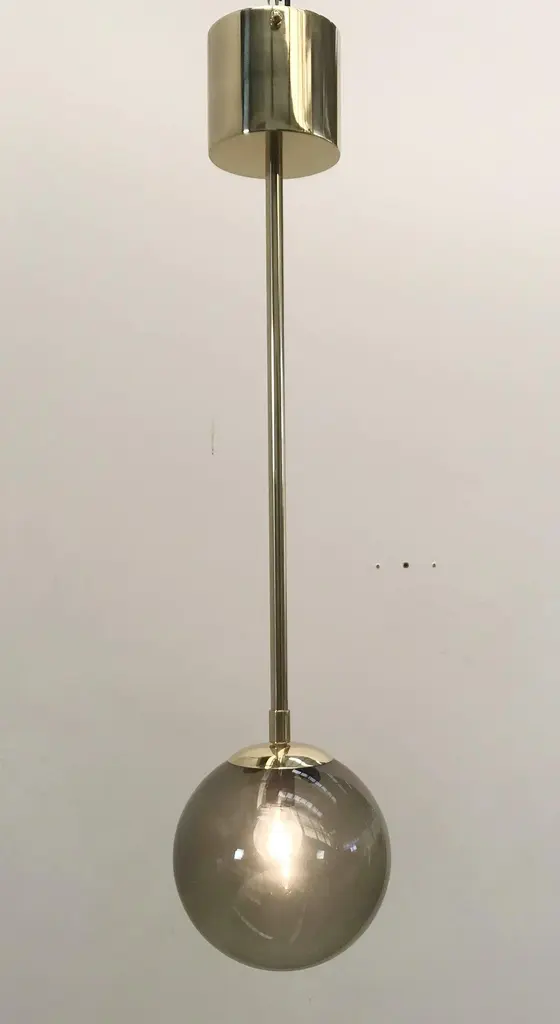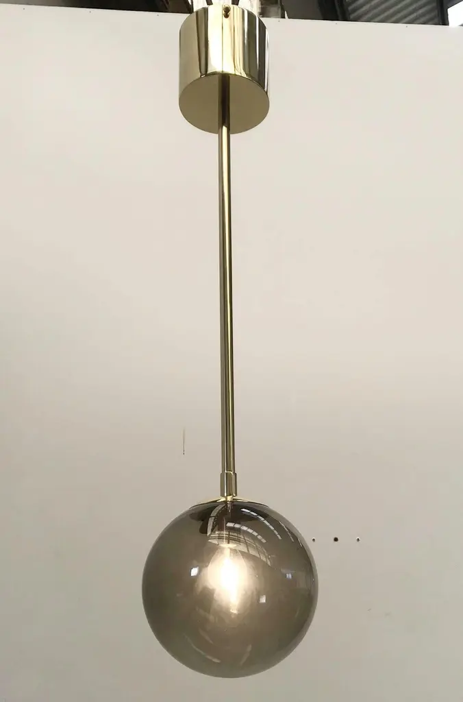 Italian pendant with Murano glass globe mounted on brass frame / Made in ItalyDesigned by Fabio Ltd, inspired by Angelo Lelli and Arredoluce styles1 light / E12 or E14 type / max 40W eachHeight: 29.5 inches / Diameter: 8 inchesOrder Only / This item ships from ItalyOrder Reference: FABIOLTD UNO GLOBE PENDANTThe listed price applies to all Brass finishes : Unlacquered Natural Brass, Unlacquered Polished Brass, Lacquered Polished Brass, Lacquered Satin BrassOther finishes available with upcharge of $150 : Bronzed, Polished Chrome, Satin Chrome, Polished Nickel, Satin Nickel, Polished Black Nickel, Satin Black Nickel, Polished Copper, Satin Copper