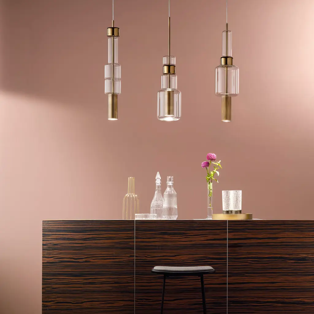 The UNO+ suspension light blends the timeless elegance of galvanically bronzed metal with three transparent borosilicate glass spheres and one bronze-hued glass sphere. It has a diameter of 150 mm and a minimum height of 800 mm and uses a GU10 bulb (not included). Its customizable design allows you to pair it with a metal stem and a selection of glass shapes in transparent and bronze hues. This fixture combines style and function, casting a soft, atmospheric glow that enhances modern spaces.