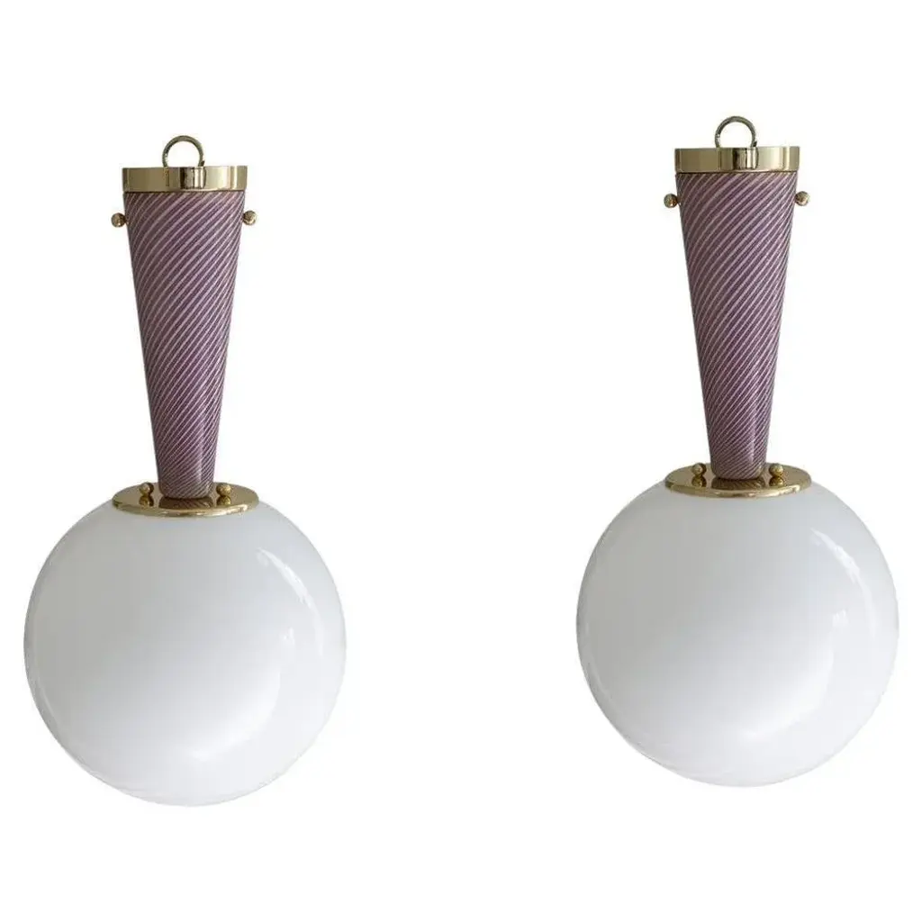 Set of 2 upside down pendant lamp 30 by magic circus editions dimensions: ø 30 x w 30 x h 57.9 cm materials: brass, mouth blown glass available finishes: lacquered polished brass / nickel available colours: blu senza tempo, verde immaginario, rosa da sogno, grigio enigmatico all our lamps can be wired according to each country. If sold to the usa it will be wired for the usa for instance. up to 250v (europe/uk standard).