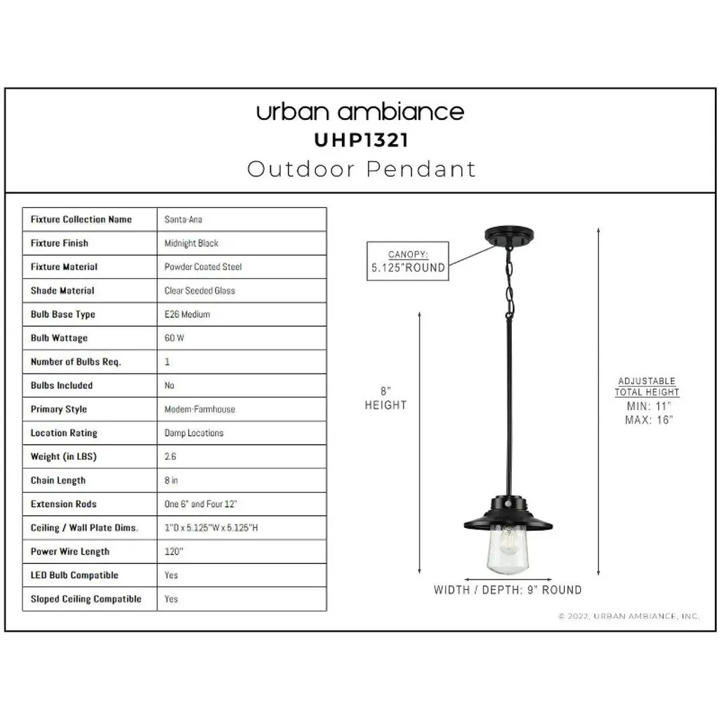 Urban Ambiance Luxury Coastal Outdoor Pendant 8''h X 9''w, Midnight Black Finish, Santa-ana Collection, Uhp1321