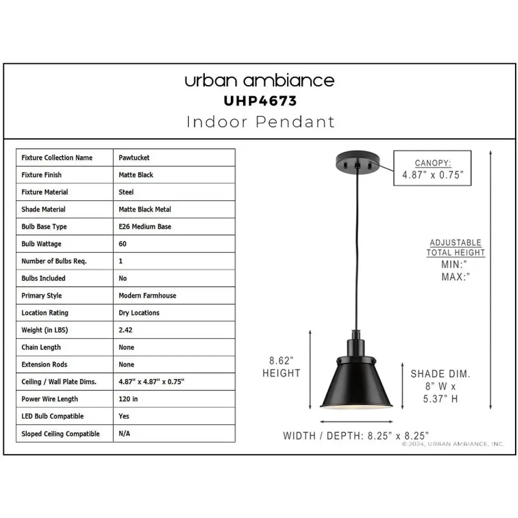 Urban Ambiance Luxury Modern Farmhouse Indoor Pendant, 8-5/8''h X 8-1/4"w X 8-1/4''d, Matte Black Finish, Uhp4673