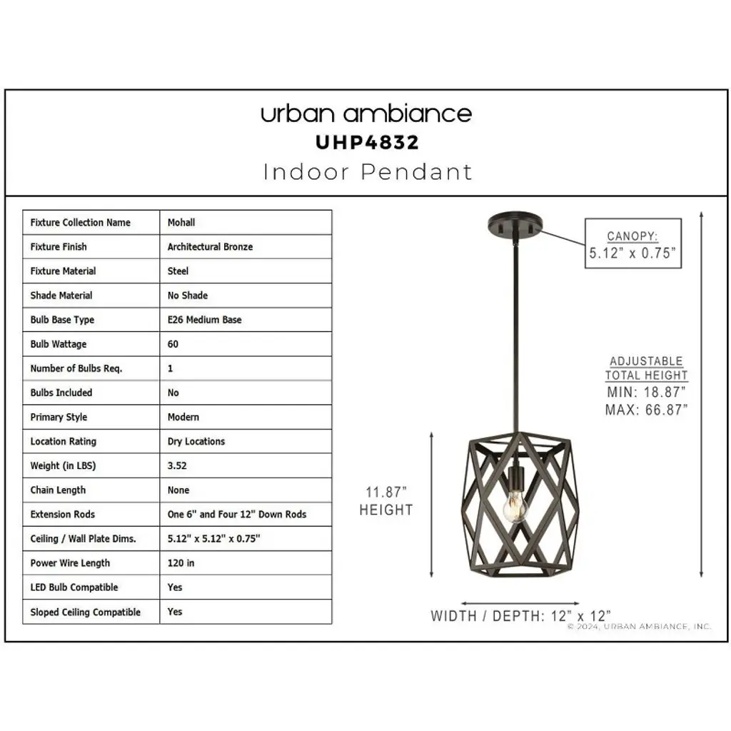 Urban Ambiance Luxury Modern Indoor Pendant, 11-7/8''h X 12"w X 12''d, Architectural Bronze Finish, Uhp4832