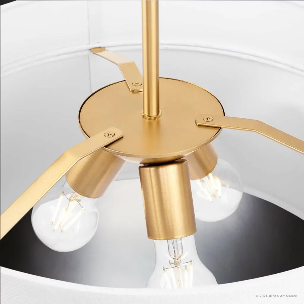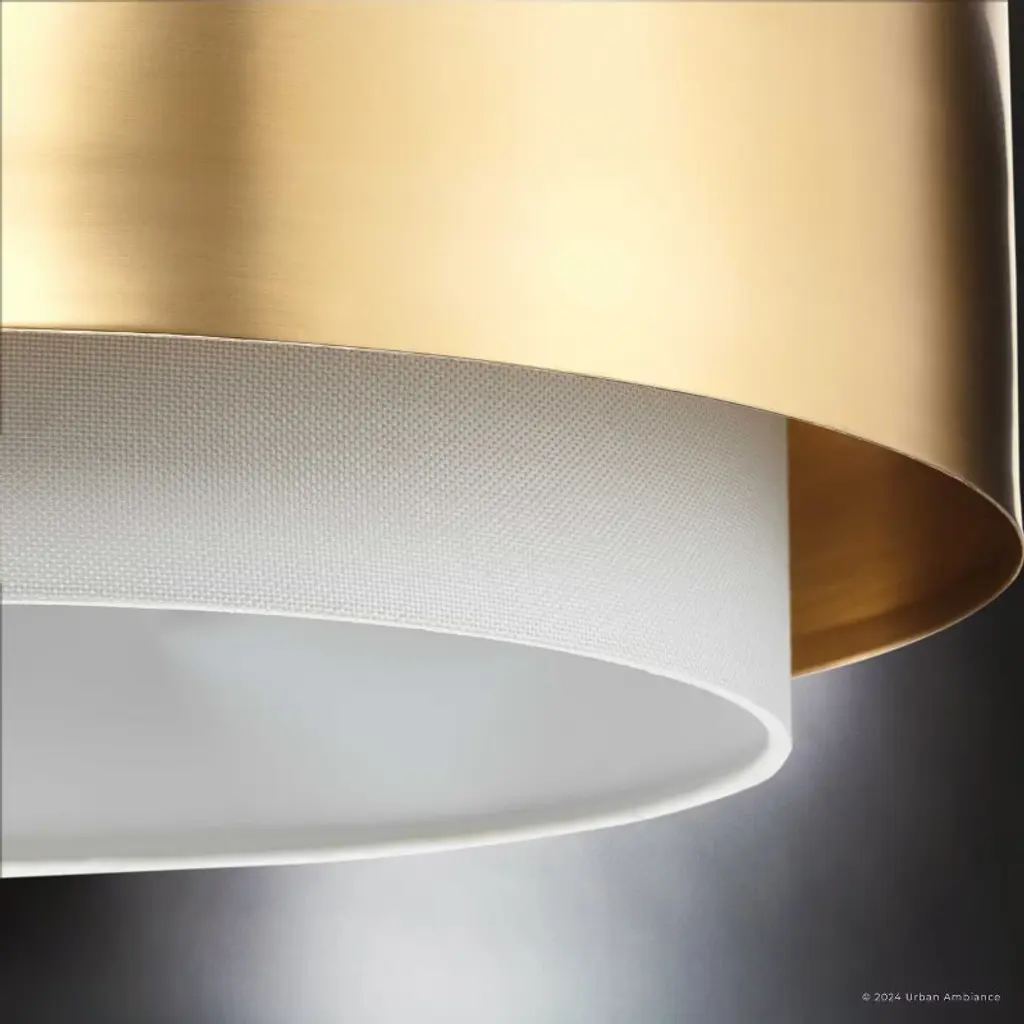 The Rochester Collection of light fixtures is a modern and elegant ensemble characterized by its distinctive layered design. The collection, available as ceiling lights, wall sconces, and pendant lights, features fixtures made from metal with a luxurious brushed bronze, brushed nickel or matte black finish. This gives them a sophisticated and contemporary appearance. Each fixture in the collection has a two-tiered structure with a cylindrical shape. The top layer is a wide metal band that encircles the fixture, creating a sleek and modern look. The lower layer is a fabric drum shade that extends slightly below the metal band, diffusing the light and providing a warm glow. The interior of the Rochester fixtures is meticulously designed for optimal lighting, produced by a single bulb. The larger pendants hold multiple bulbs, each housed in a brushed nickel, bronze, or matte black socket. These bulbs are positioned to distribute light evenly throughout the fabric diffuser. The bulbs and sockets are attached to a circular, central metallic plate, which is connected to the metal rod that suspends the fixture from the ceiling. The central plate is supported by metallic arms that extend outward to attach to the inner edge of the brass band, providing structural stability and ensuring the components are securely held in place. The fixtures in the Rochester Collection are designed for secure mounting. The pendant lights are suspended from the ceiling by a metal rod, which matches the finish of the fixture. This rod is connected to a circular ceiling canopy, ensuring a secure and stable installation. The wall sconces are mounted flush on the wall with the flat side of the semi-cylinder facing the wall, while the ceiling lights are mounted flush on the ceiling. The layered design adds depth and dimension, making the fixture a striking focal point in any room. The combination of the sleek band and the soft fabric shade creates a balanced and visually appealing contrast.