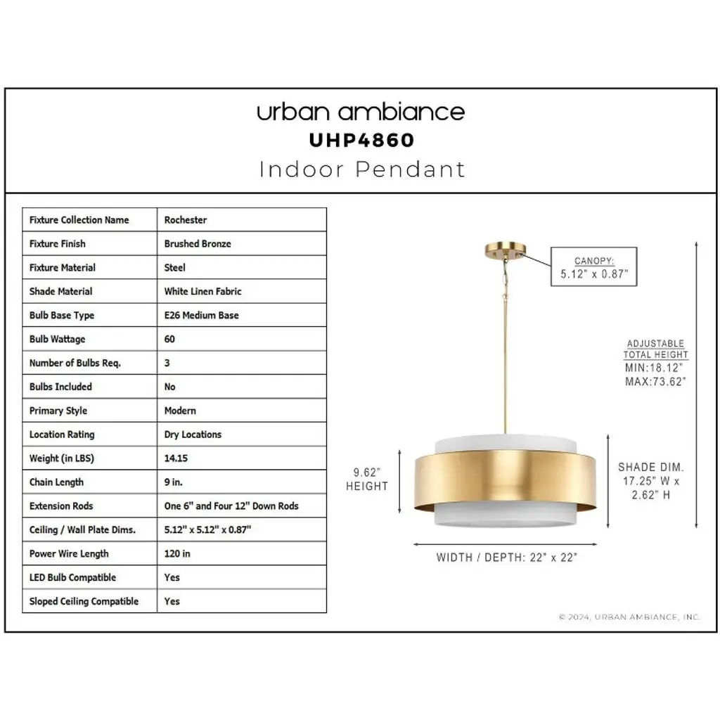 Urban Ambiance Luxury Modern Indoor Pendant, 9-5/8''h X 22"w X 22''d, Brushed Bronze Finish, Uhp4860