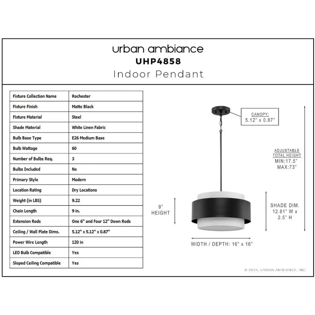Urban Ambiance Luxury Modern Indoor Pendant, 9''h X 16"w X 16''d, Matte Black Finish, Uhp4858