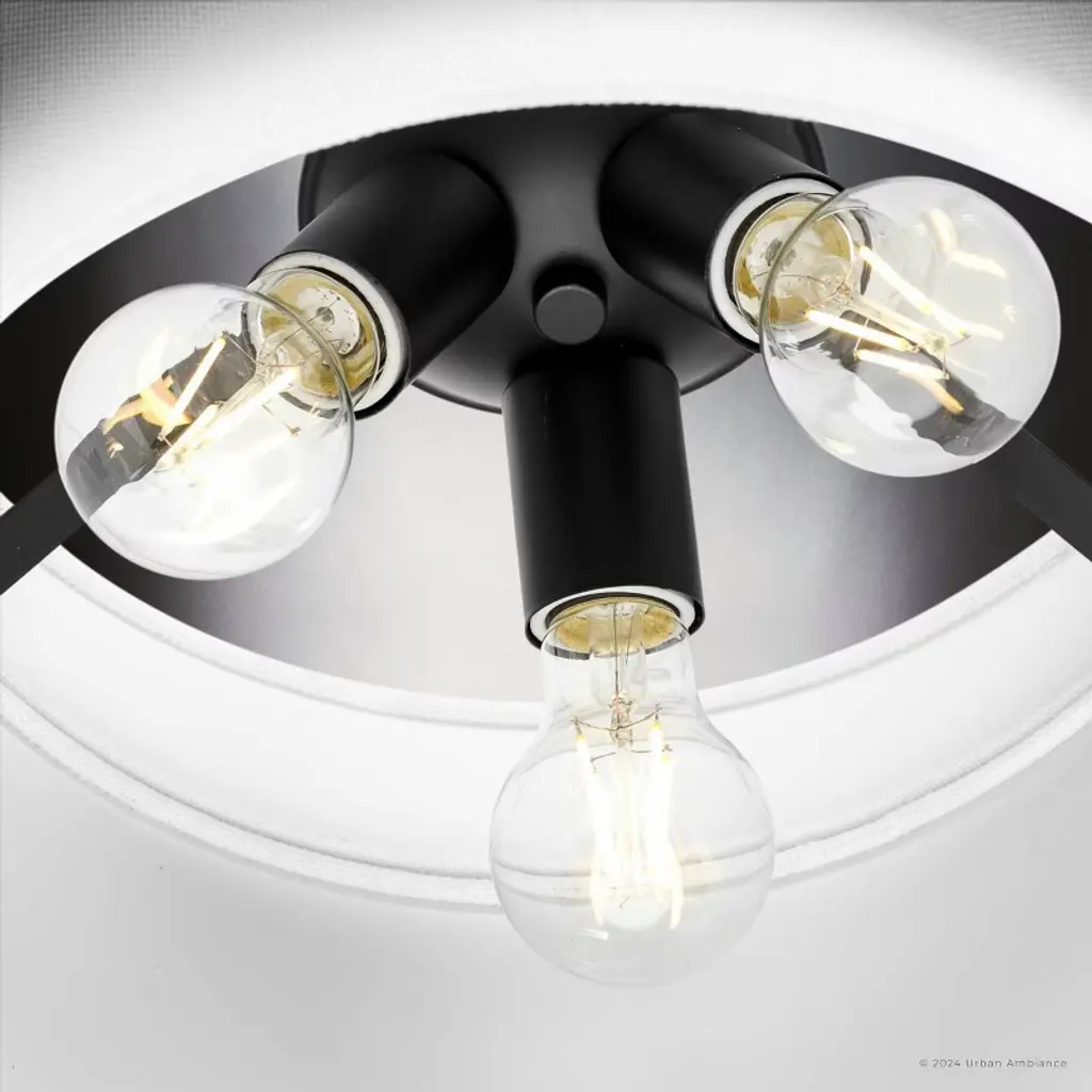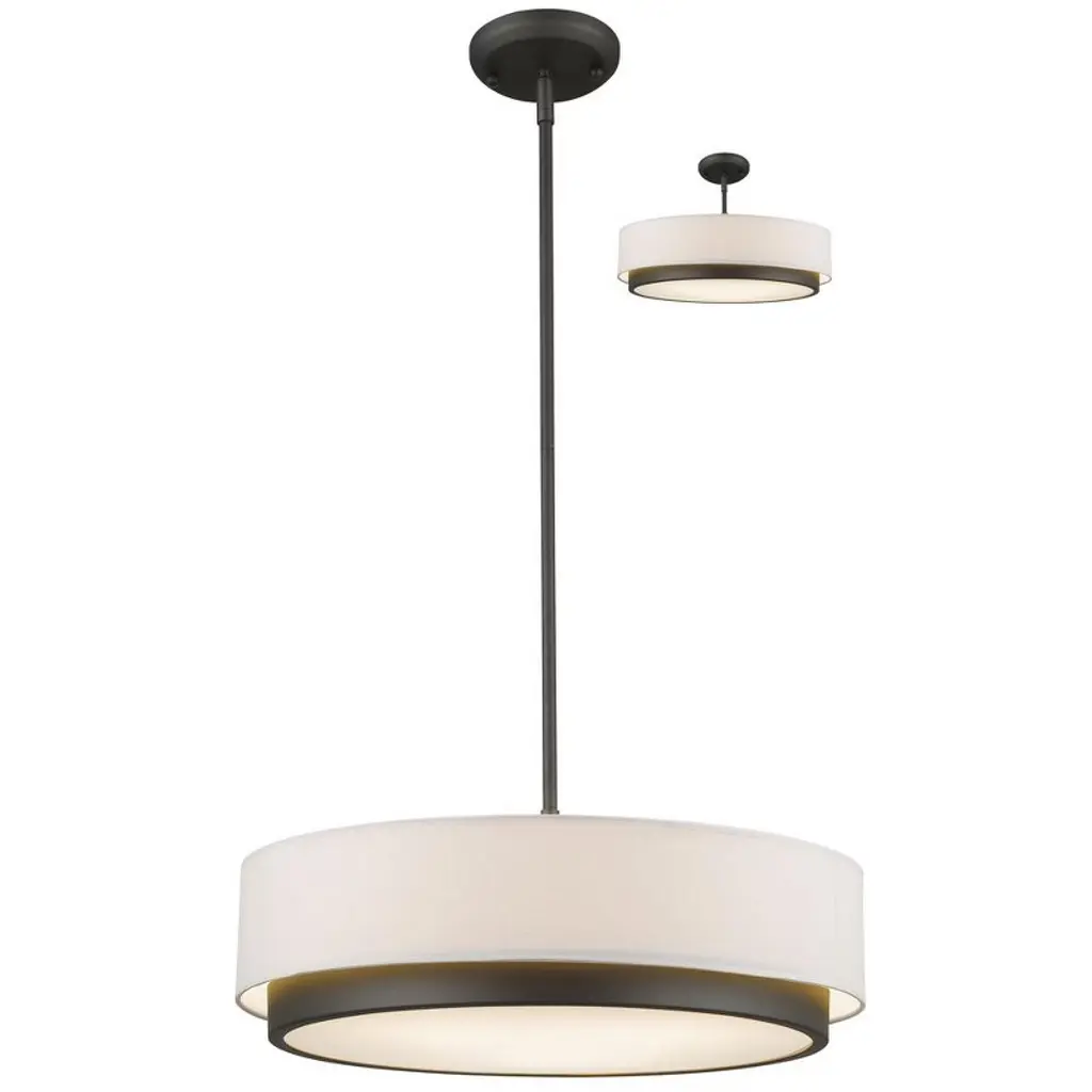 The Rochester Collection of light fixtures is a modern and elegant ensemble characterized by its distinctive layered design. The collection, available as ceiling lights, wall sconces, and pendant lights, features fixtures made from metal with a luxurious brushed bronze, brushed nickel or matte black finish. This gives them a sophisticated and contemporary appearance. Each fixture in the collection has a two-tiered structure with a cylindrical shape. The top layer is a wide metal band that encircles the fixture, creating a sleek and modern look. The lower layer is a fabric drum shade that extends slightly below the metal band, diffusing the light and providing a warm glow. The interior of the Rochester fixtures is meticulously designed for optimal lighting, produced by a single bulb. The larger pendants hold multiple bulbs, each housed in a brushed nickel, bronze, or matte black socket. These bulbs are positioned to distribute light evenly throughout the fabric diffuser. The bulbs and sockets are attached to a circular, central metallic plate, which is connected to the metal rod that suspends the fixture from the ceiling. The central plate is supported by metallic arms that extend outward to attach to the inner edge of the brass band, providing structural stability and ensuring the components are securely held in place. The fixtures in the Rochester Collection are designed for secure mounting. The pendant lights are suspended from the ceiling by a metal rod, which matches the finish of the fixture. This rod is connected to a circular ceiling canopy, ensuring a secure and stable installation. The wall sconces are mounted flush on the wall with the flat side of the semi-cylinder facing the wall, while the ceiling lights are mounted flush on the ceiling. The layered design adds depth and dimension, making the fixture a striking focal point in any room. The combination of the sleek band and the soft fabric shade creates a balanced and visually appealing contrast.