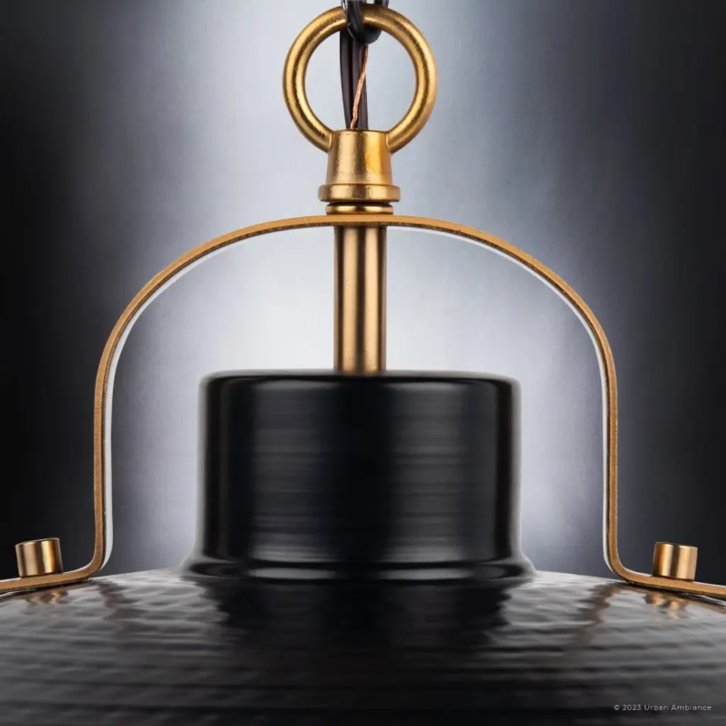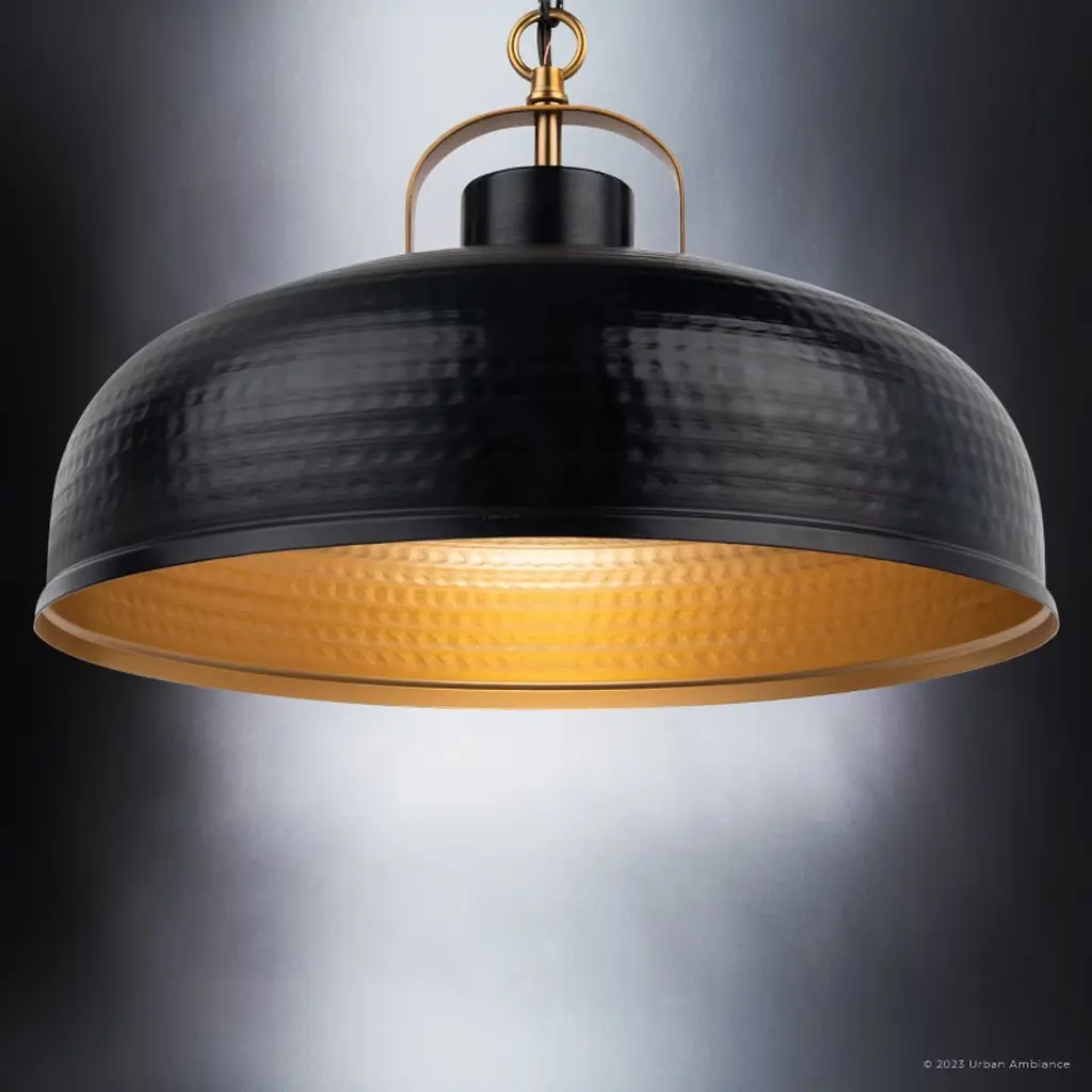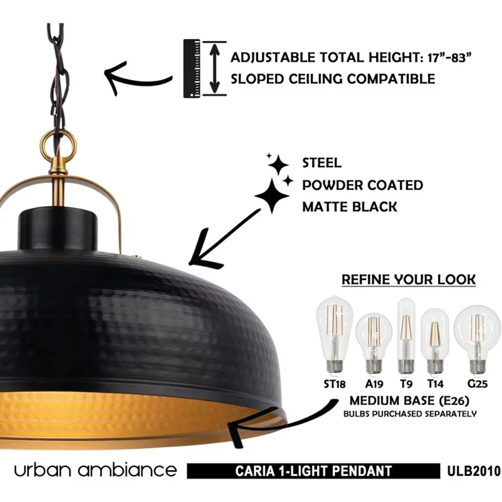 Inspired by modern industrial lighting, the Caria fixture effortlessly adds a touch of “luxe-industrial” charm to any space. At 15-3/4" wide by 10-3/4" high, this pendant light is perfectly proportioned to make a bold statement without overwhelming your room. Its versatile design makes it an excellent addition to a variety of rustic interior settings. Crafted from steel, the Caria pendant light comes with an open bottom dome design that allows the bulb to be seen. The dome’s black finish exterior, chain, and canopy lend a sleek and sophisticated appeal, while the gold finish interior reflects the light beautifully, to create a warm and inviting ambiance. To attach the dome to the chain, gold metal appointments are used, complementing the golden dome interior while elegantly contrasting the fixture exterior.