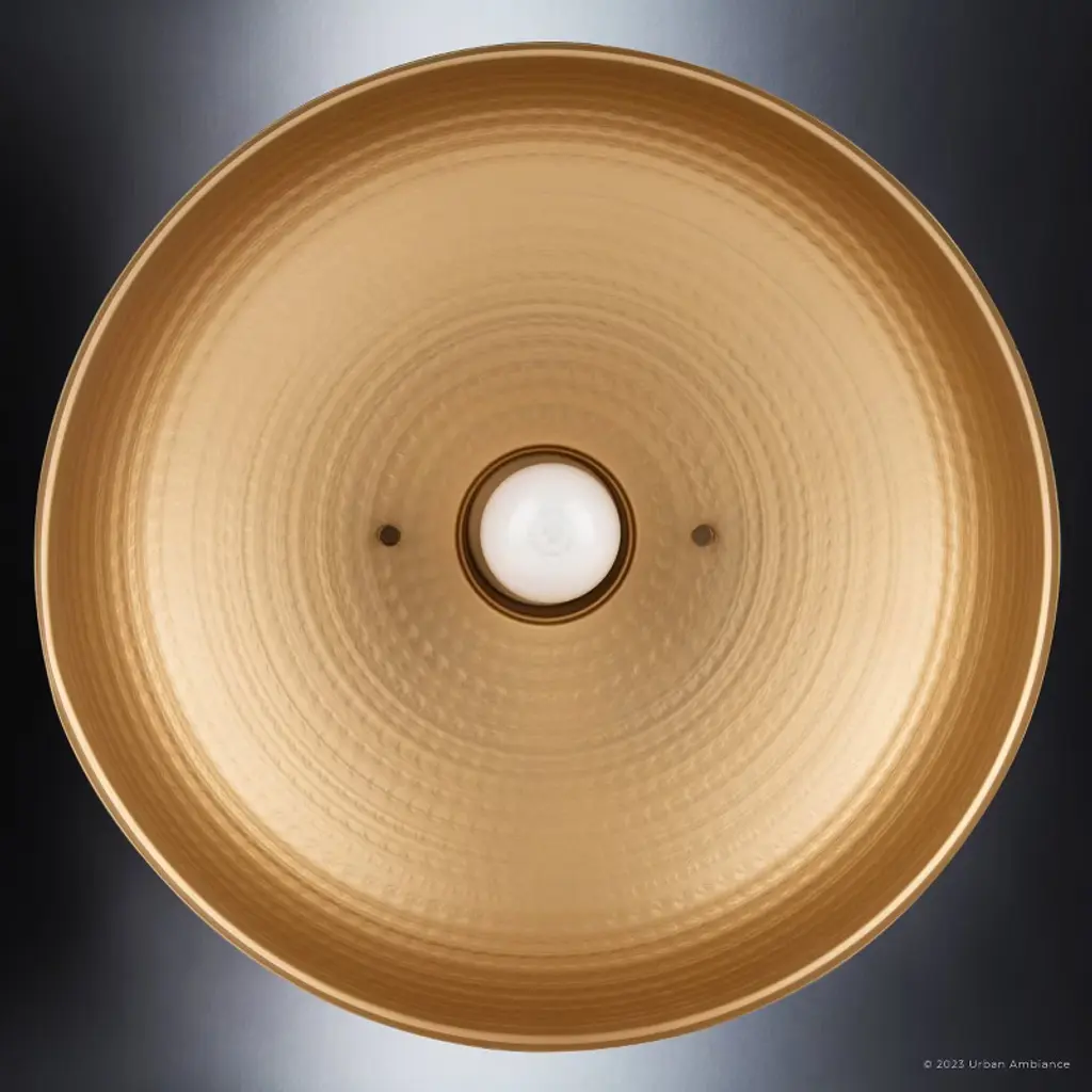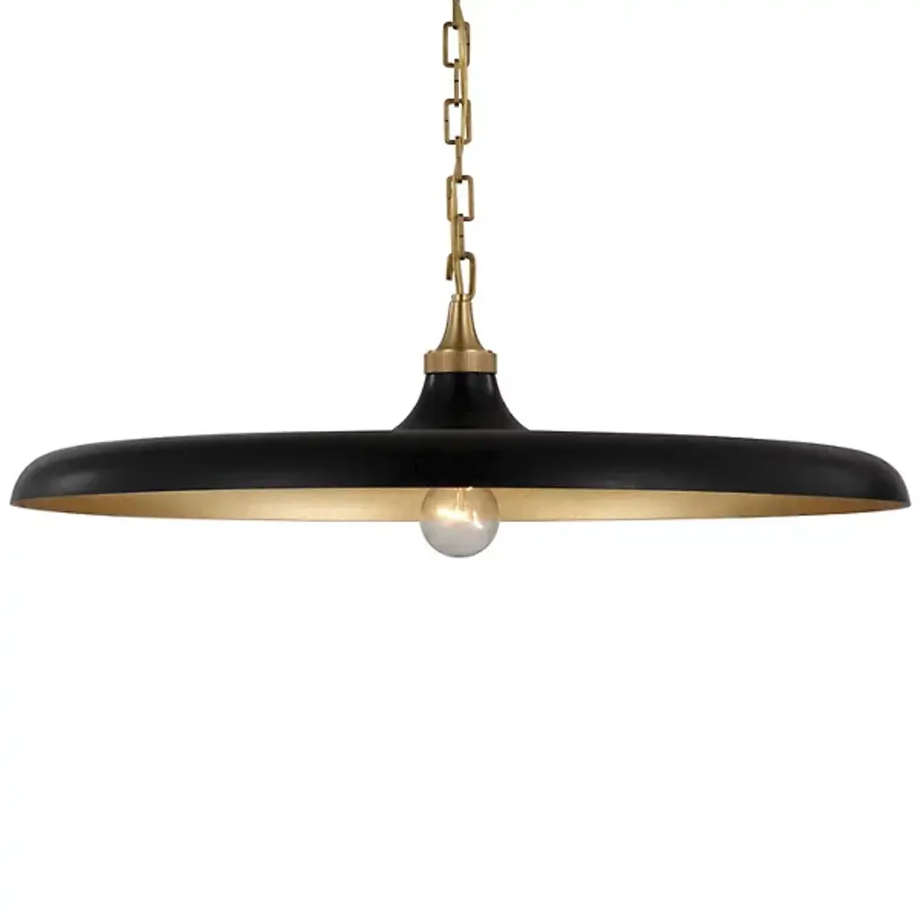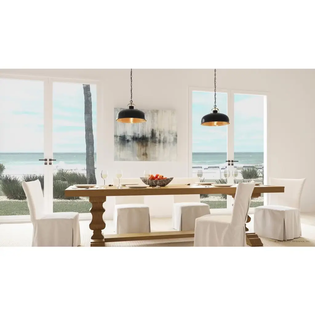 Inspired by modern industrial lighting, the Caria fixture effortlessly adds a touch of “luxe-industrial” charm to any space. At 15-3/4" wide by 10-3/4" high, this pendant light is perfectly proportioned to make a bold statement without overwhelming your room. Its versatile design makes it an excellent addition to a variety of rustic interior settings. Crafted from steel, the Caria pendant light comes with an open bottom dome design that allows the bulb to be seen. The dome’s black finish exterior, chain, and canopy lend a sleek and sophisticated appeal, while the gold finish interior reflects the light beautifully, to create a warm and inviting ambiance. To attach the dome to the chain, gold metal appointments are used, complementing the golden dome interior while elegantly contrasting the fixture exterior.