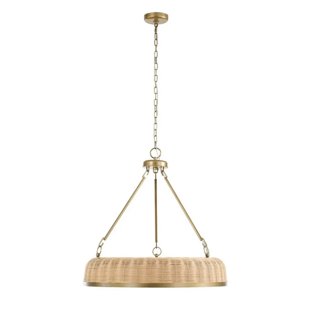 The Uttermost Ladakh 9 Light Round Wicker Pendant delivers bold texture and warm, natural appeal through its handcrafted woven cane shade and sculptural form. Measuring 27 inches wide and 28 inches tall, this large-scale pendant makes a dramatic statement while maintaining a light, airy presence. The round shape features a symmetrical design made from woven cane panels supported by an iron framework, offering both strength and organic beauty. Designed for 110V electrical systems and equipped with nine lights, this pendant casts generous illumination, making it ideal for larger spaces such as dining rooms, great rooms, or vaulted entries. The layered weave creates rich shadows and soft diffusion, balancing function and style in one show-stopping fixture. Large 9-light capacity fills spacious rooms with consistent lighting27 inch diameter makes it a centerpiece fixture for open-plan spaces28 inch height gives vertical impact, ideal for rooms with taller ceilingsNatural woven cane brings warmth, texture, and handcrafted styleOffers soft diffusion of light with subtle shadow play from the weavePerfect for use above dining tables, in living rooms, or as an entryway chandelierVersatile color palette coordinates with woods, neutrals, and earth tonesLightweight cane construction makes installation manageable despite its size