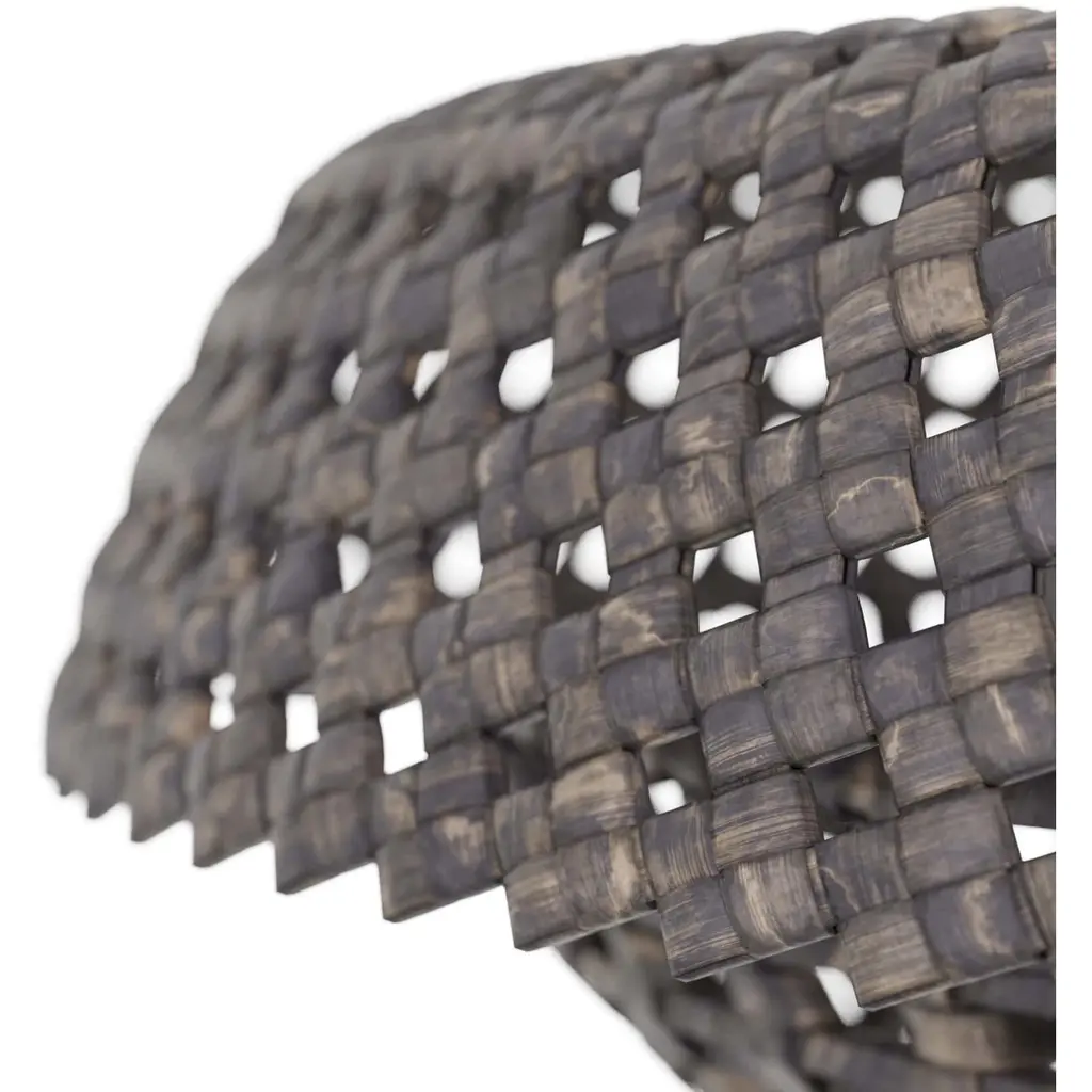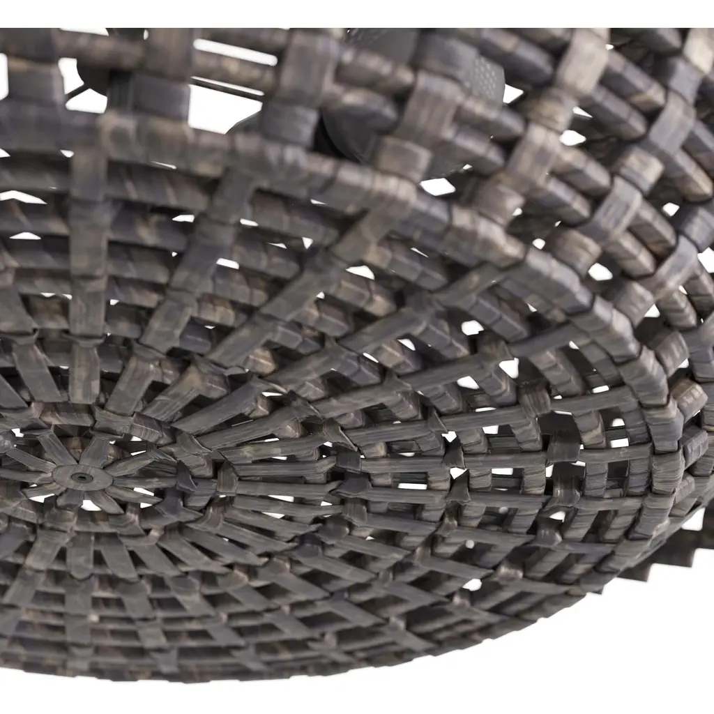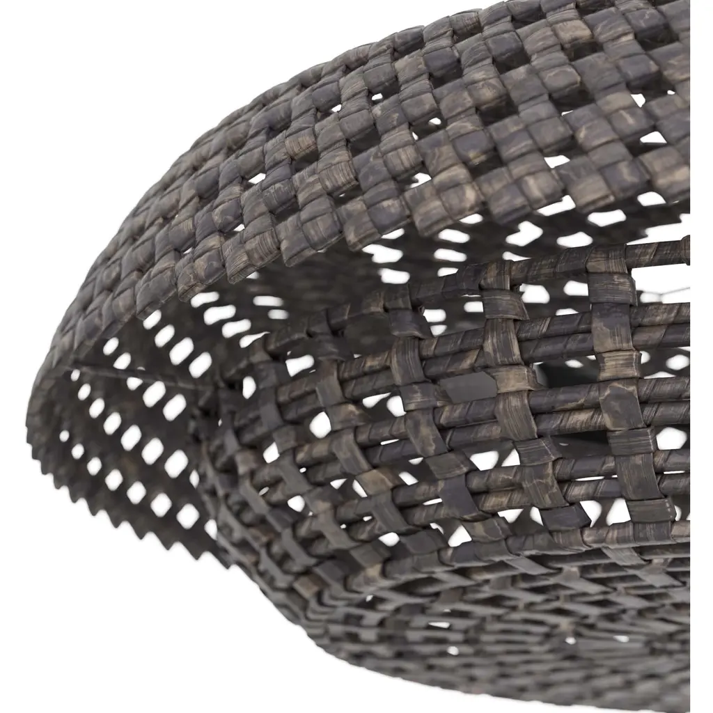 Working in gray-washed raffia, artisans expertly crafted the valdez pendant, which features an interlocking basket design. The low-profile illuminator is created with two different patterns—a checkered weave for the base and a diamond weave forming the cover. The pendant is fitted with a suspension pipe of bronzed iron. Finish will vary.