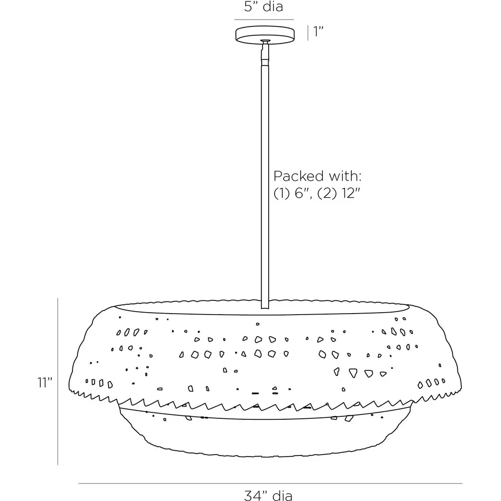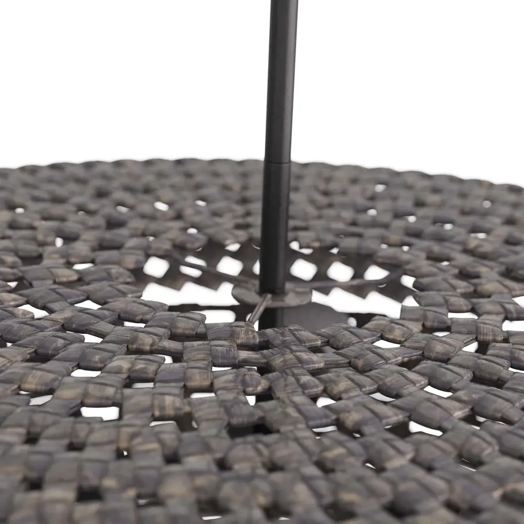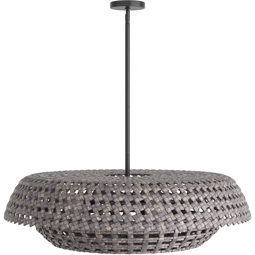 Working in gray-washed raffia, artisans expertly crafted the valdez pendant, which features an interlocking basket design. The low-profile illuminator is created with two different patterns—a checkered weave for the base and a diamond weave forming the cover. The pendant is fitted with a suspension pipe of bronzed iron. Finish will vary.