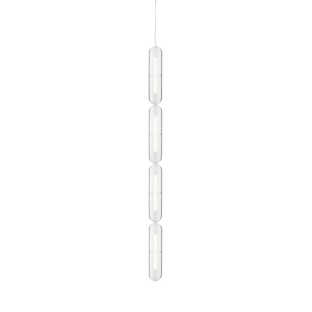 In vertical formation that ranges from a single unit to multiples up to 6 in length, designer Caine Heintzman creates a striking linear pendant for his Vale System. Placing the sculptural LED modules in an end-to-end arrangement brings a glowing column of warmly soft and multidirectional illumination diffused through each textured acrylic lens.