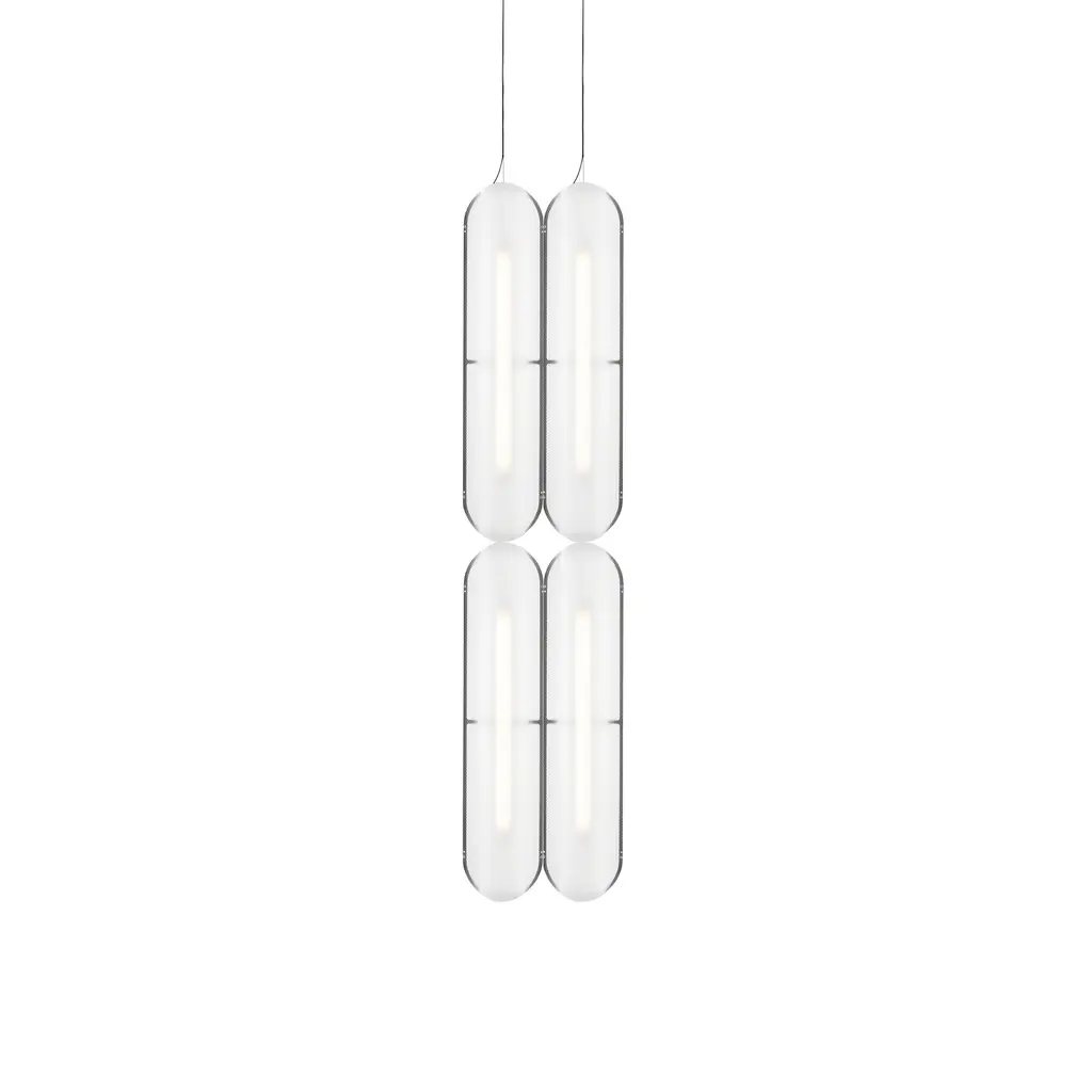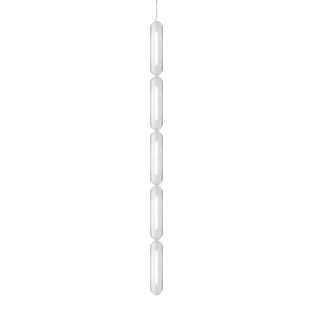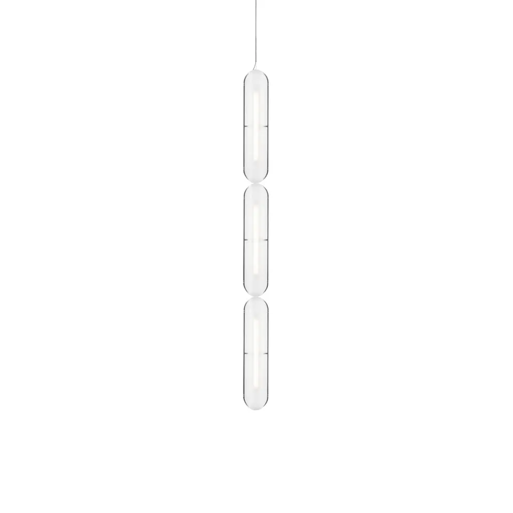 In vertical formation that ranges from a single unit to multiples up to 6 in length, designer Caine Heintzman creates a striking linear pendant for his Vale System. Placing the sculptural LED modules in an end-to-end arrangement brings a glowing column of warmly soft and multidirectional illumination diffused through each textured acrylic lens.