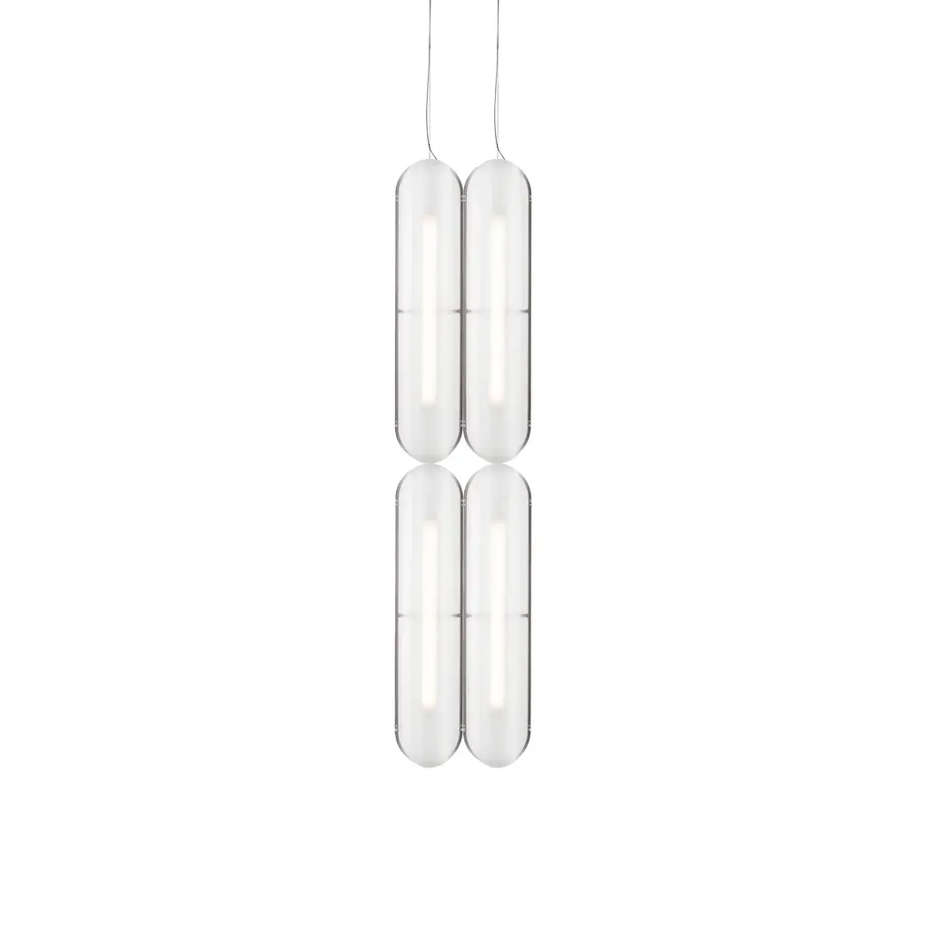 Modular glass-inspired lenses in this vertically oriented pendant diffuse light to produce gentle gradients and layered reflections. Side-to-end connectivity allows the fixture to be extended from a single unit to a vertical stack of up to six modules, enabling scalable compositions. An integrated 20W LED provides dim-to-warm lighting with a CRI above 90, ensuring both warmth and clarity. Made from aluminum and textured acrylic, the pendant is available in finishes such as Anthracite, Rust, and Silica.