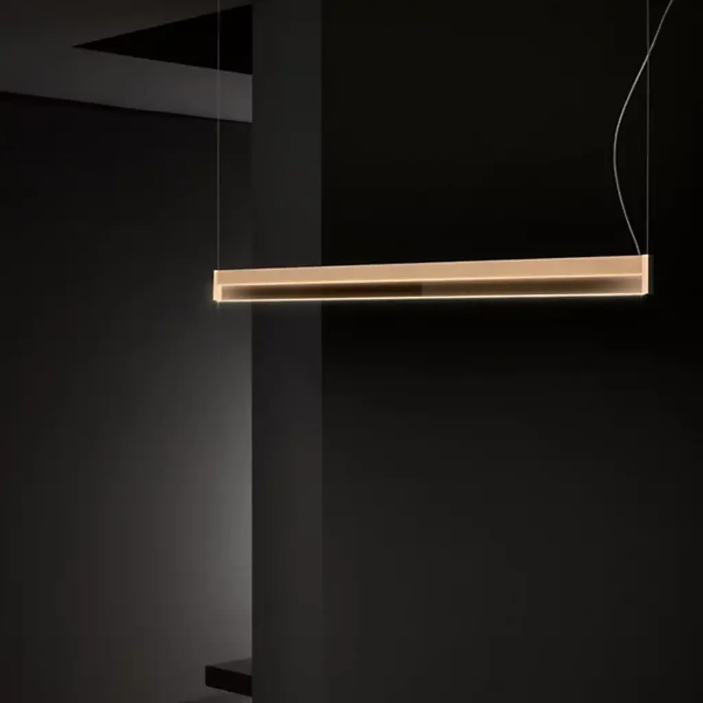 Designer Caine Heintzman's ingenious Vale System adds a horizontally oriented X-Axis pendant ranging from a single LED module up to 6 units placed end-to-end. The seemingly floating fixture hangs by thin wires from the ceiling and creates a softly warm and multidirectional illumination via each prismatic acrylic lens.