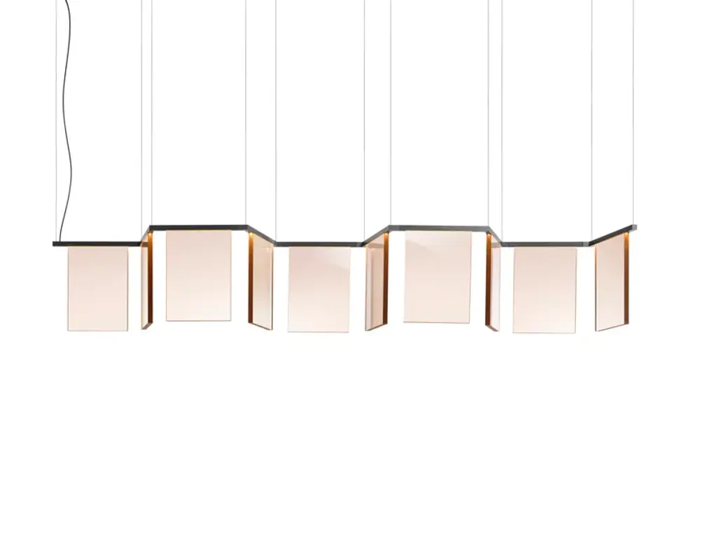 Designer Caine Heintzman's modular Vale System adds an end-to-end pendant that offers configurations of up to 6 horizontal LED units. The undulating profile of each light's lens reveals a striking gradient that creates a soft hue and ambient diffusion. Vale's suspended frame, sleekly containing the mounting system and electricals, comes in a choice of anthracite, silica or rust finishes to suit residential and contract spaces alike.