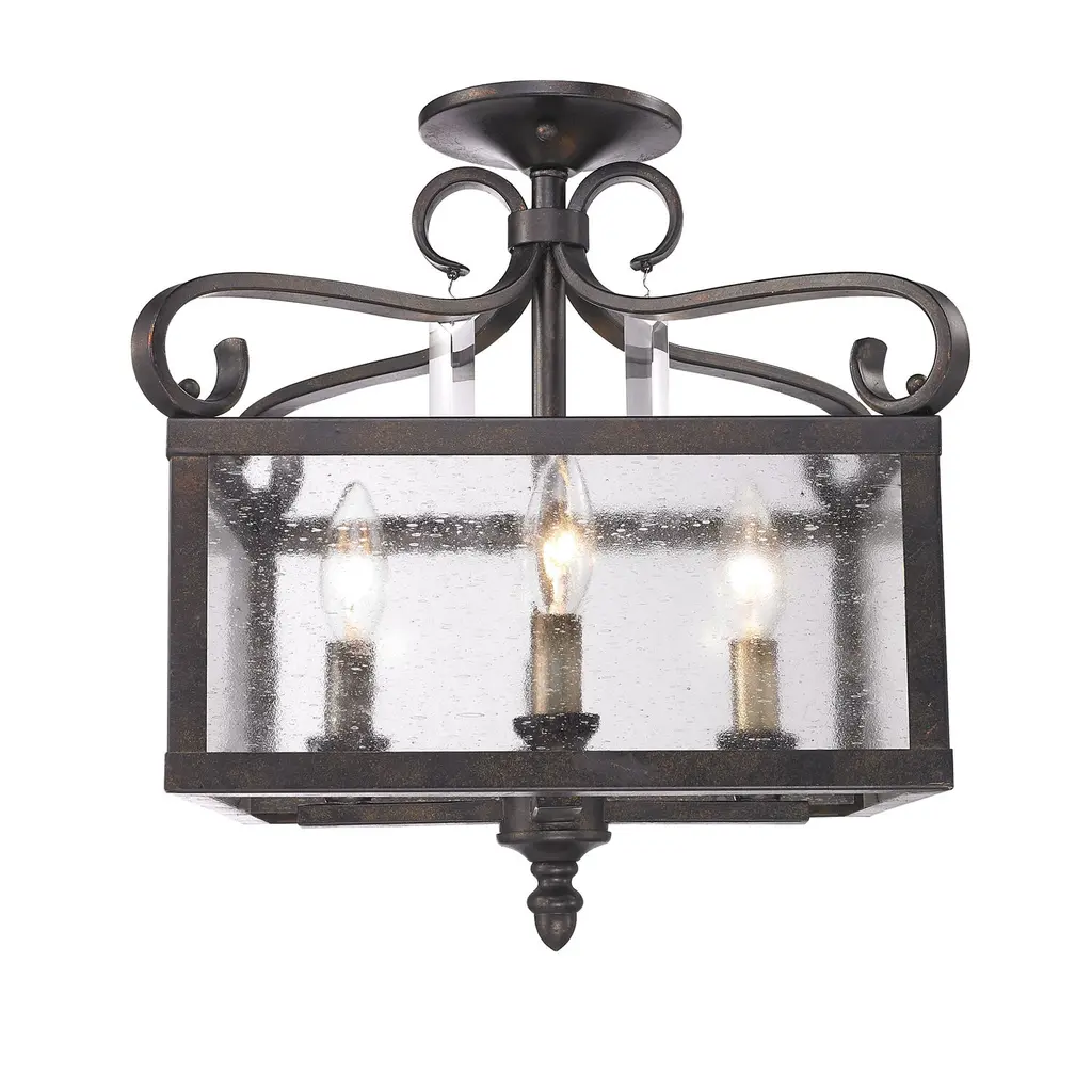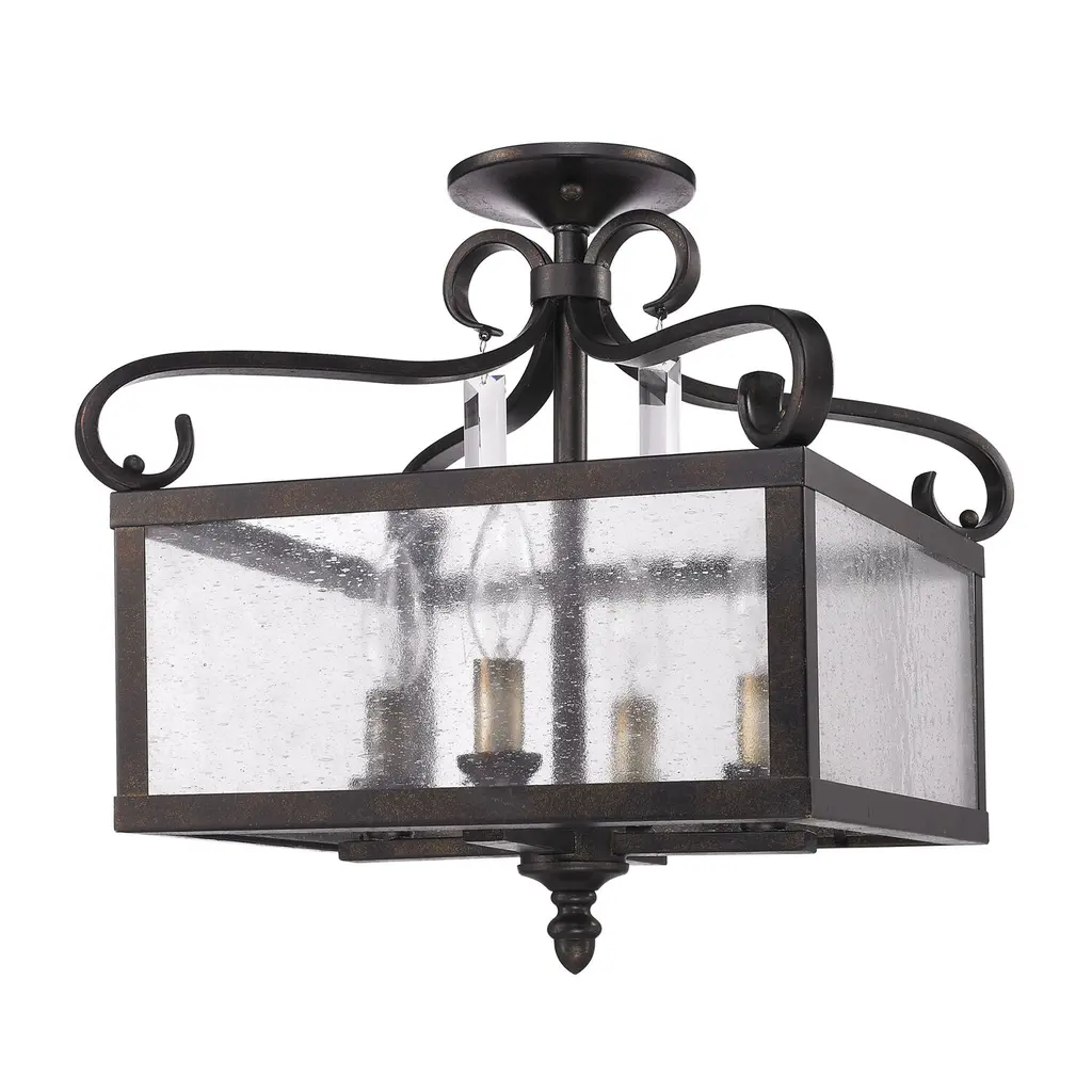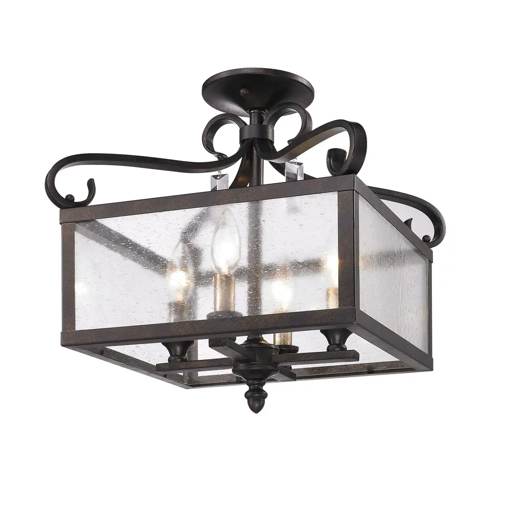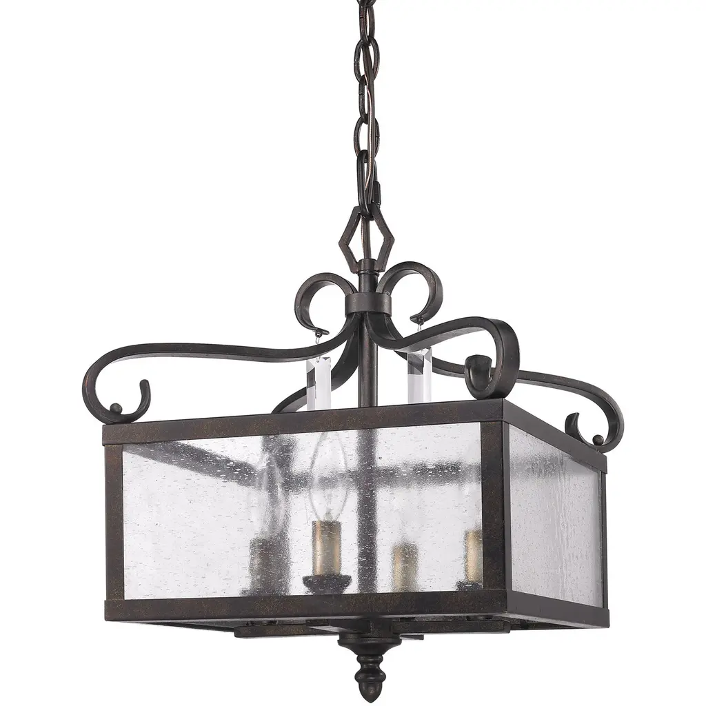 Bring Traditional elegance into your home with the Golden Lighting Valencia 4-light Pendant. Featuring a glass shade and a Fired Bronze frame, it creates a warm and inviting atmosphere. The Seeded Glass shade, infused with tiny air bubbles, adds a unique texture and vintage character, delivering a brilliant sparkle when illuminated. The Fired Bronze finish boasts deep, rustic authenticity with its tactile texture and warm highlights. Perfect for indoor spaces not subject to moisture, this pendant can be installed as a semi-flush mount or pendant with adjustable height (min: 19.75"- max: 91.75"). Overall dimensions are 18.5"W x 16.75"H x 18.5"D, requiring 4 E12 Candelabra base bulbs (not included, max 60 wattage). Discover the blend of history and elegance with this beautiful lighting fixture.