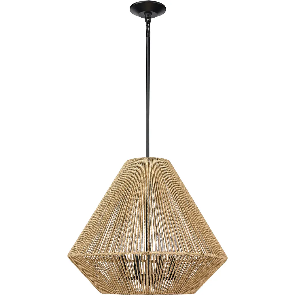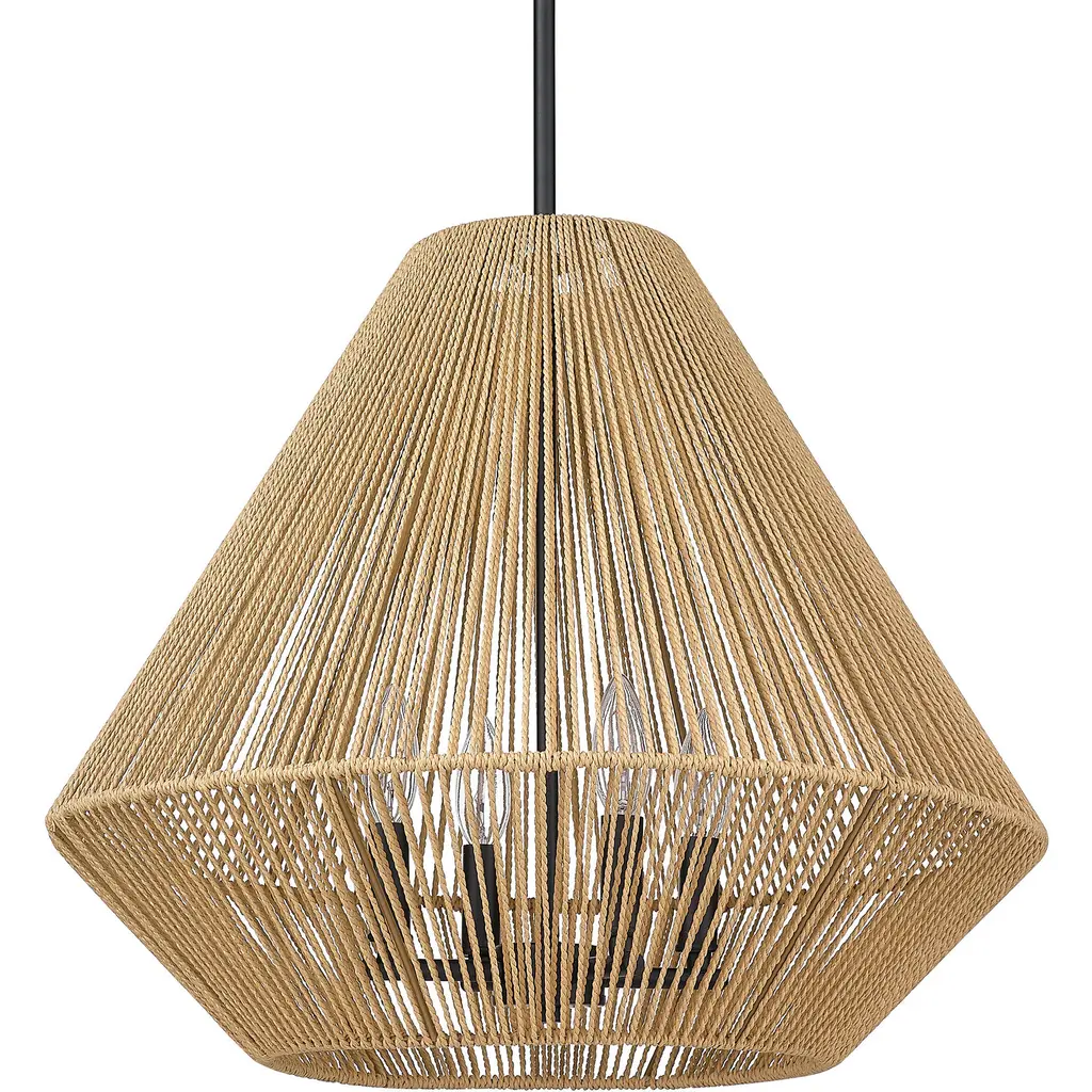 Infuse modern artistry into your home with the Golden Lighting Valentina 4-light Pendant. Featuring a sophisticated Rope shade paired with a sleek Matte Black frame, it creates a welcoming atmosphere. The Rope shade, crafted from Natural Raphia, showcases a light tan, twisted cord woven in an open pattern, enhancing the relaxed elegance of the design. The Matte Black finish offers a timeless, versatile option that complements various decors. This pendant light is dry location rated, perfect for indoor spaces not exposed to moisture, and is adjustable in height to suit your unique installation needs. Measuring 21"W x 17.75"H x 21"D, it requires four E12 Candelabra base bulbs (not included) with a maximum wattage of 60. Experience quality craftsmanship and aesthetic appeal with this striking lighting fixture.
