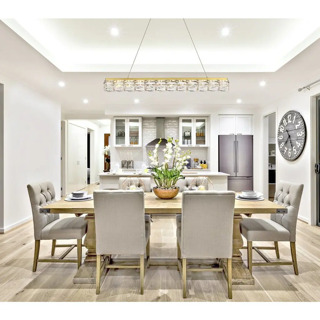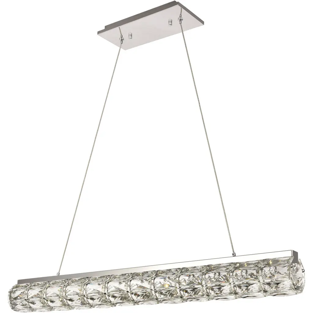 Valetta hanging fixtures dress up a living room, dining room, or bedroom without overwhelming the surrounding décor. This collection features an octagonal tube-shaped stainless-steel frame that’s covered almost entirely with shining rectangular clear crystals. A rectangular mounting plate is connected to the frame by slender cables that keep everything secure. A sleek metal finish completes this modern look with warm led lighting. Available in three sizes.