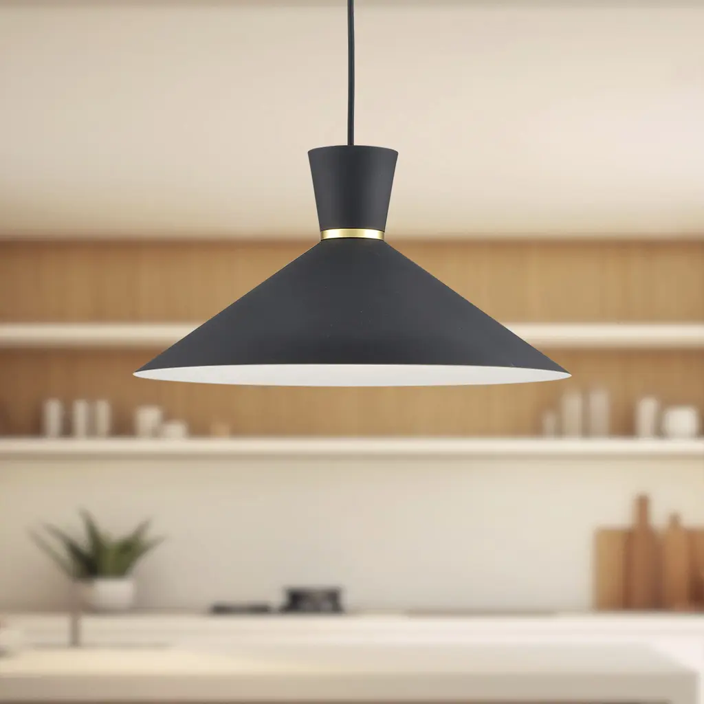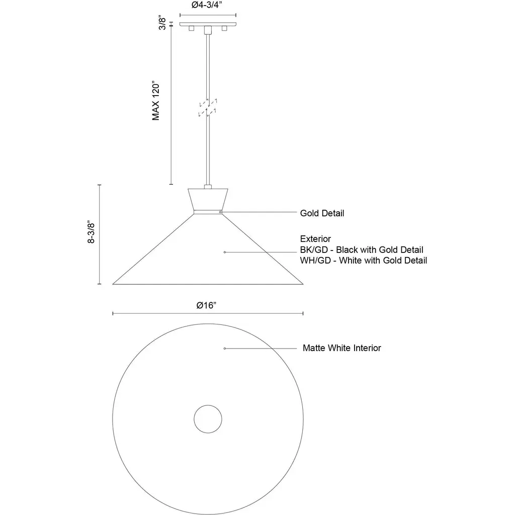 Single-lamp pendant with conical aluminum shade with fine powder-coated finishes and anodized gold ring detail. Exterior shade colors are white or black, with matte white interior. Suspended by cloth cable