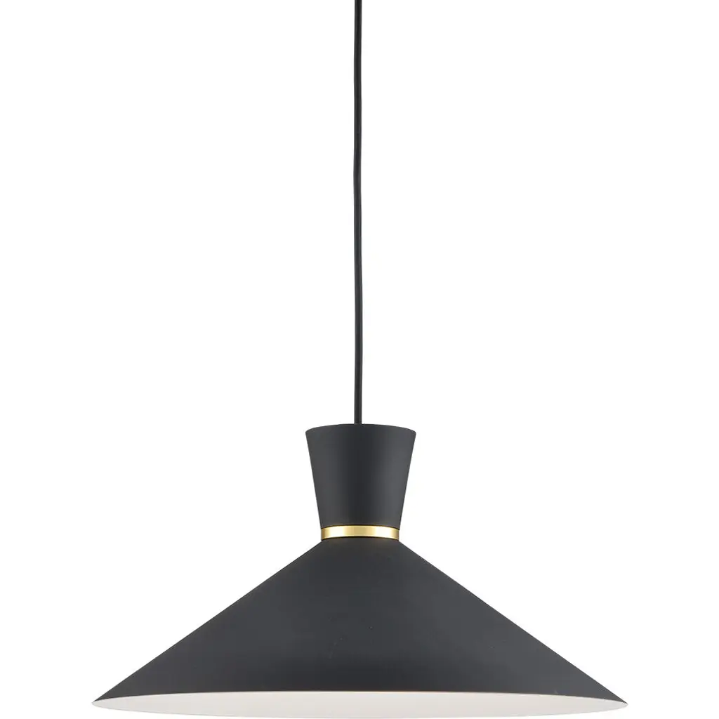 Single-lamp pendant with conical aluminum shade with fine powder-coated finishes and anodized gold ring detail. Exterior shade colors are white or black, with matte white interior. Suspended by cloth cable