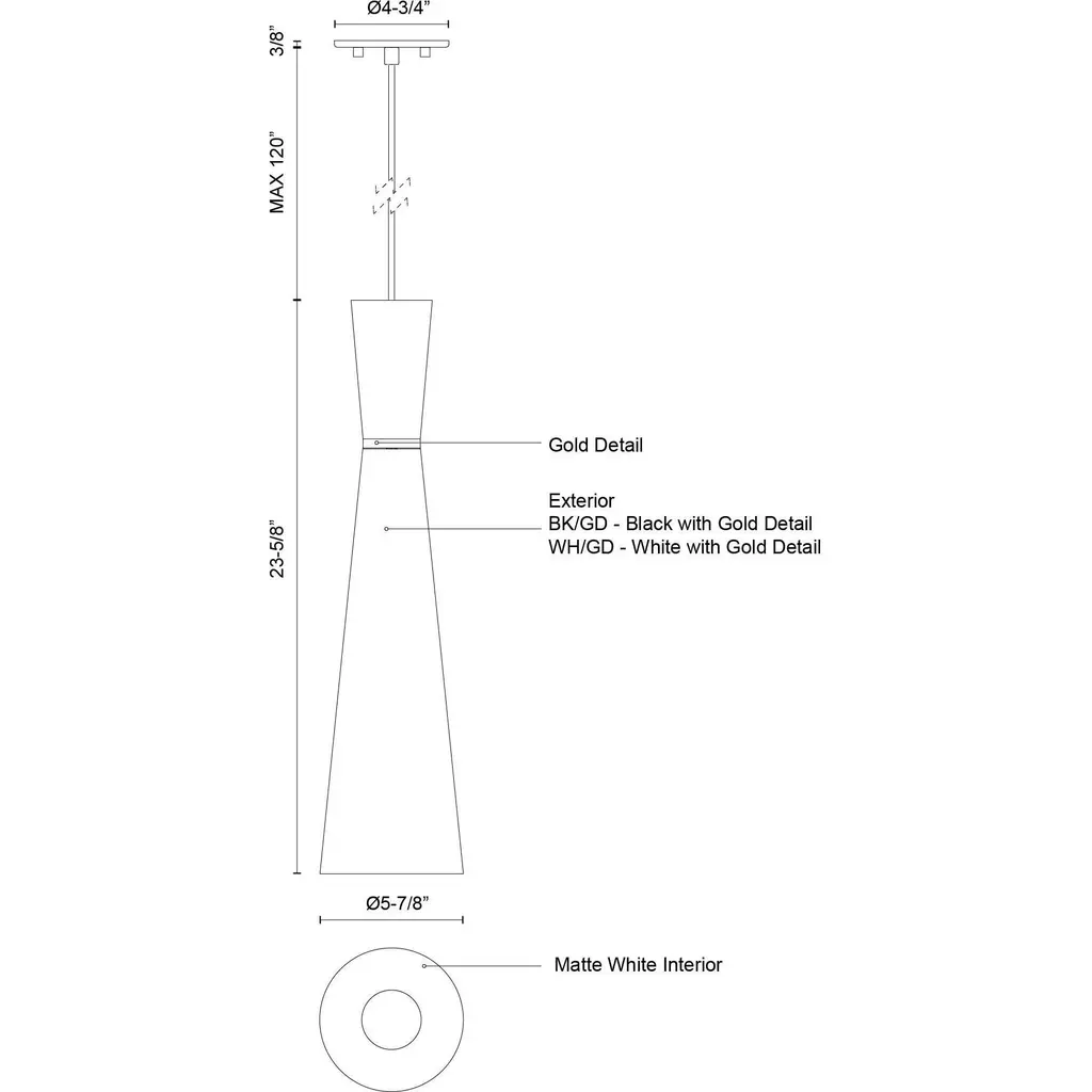 Single-lamp pendant with conical aluminum shade with fine powder-coated finishes and anodized gold ring detail. Exterior shade colors are white or black, with matte white interior. Suspended by cloth cable