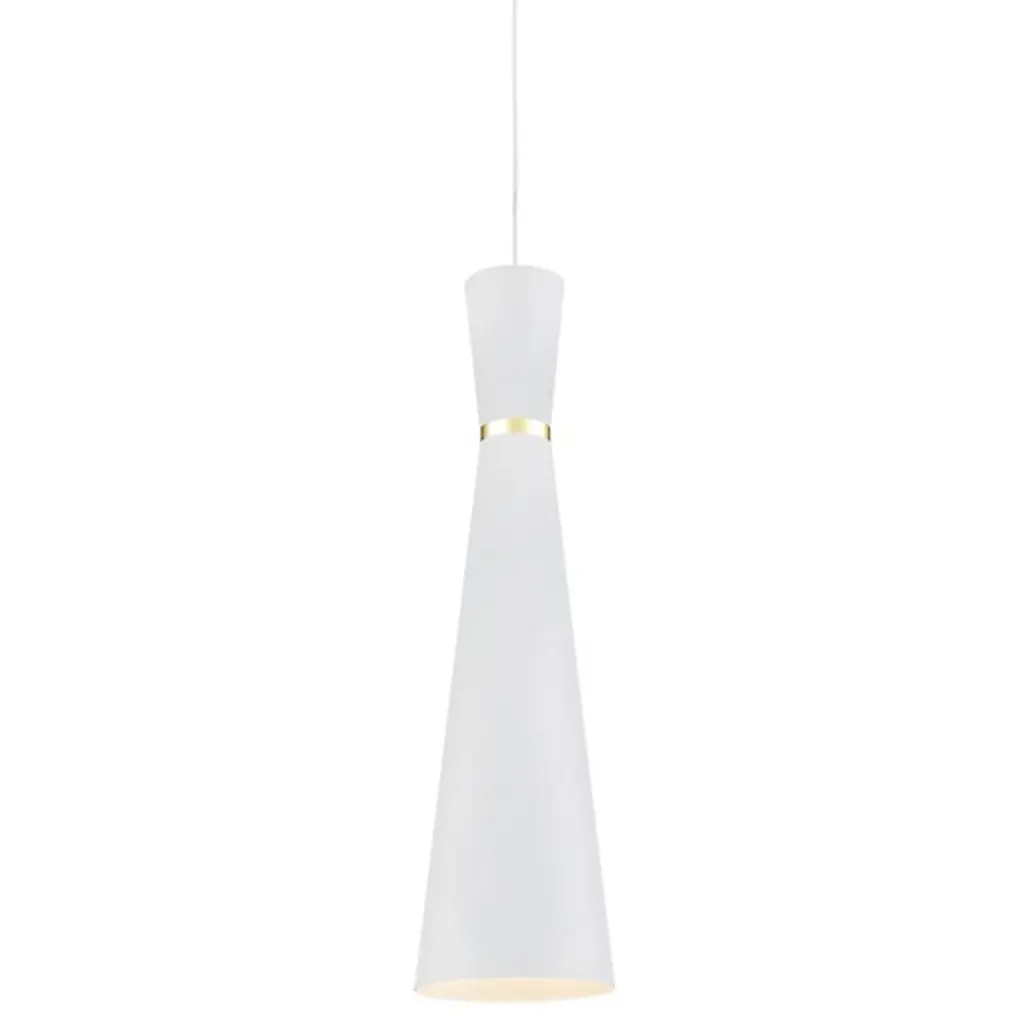 The Vanderbilt Mini Pendant by Kuzco Lighting is a stark and sophisticated fixture with a mid-century modern flair. Suspended from a thin adjustable cord, its dual cone silhouette is formed from powder-coated aluminum that takes on an elongated shape. A contrasting metal band adds a stylish accent without impeding its minimal design. The incandescent light nestled within the shade casts a warm downlight while illuminating the shade’s interior for a striking addition to any space.