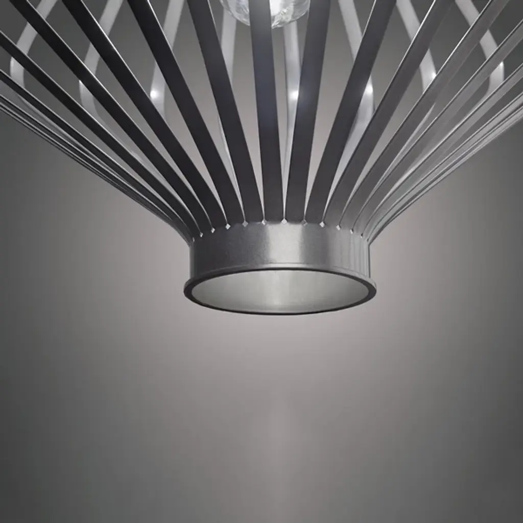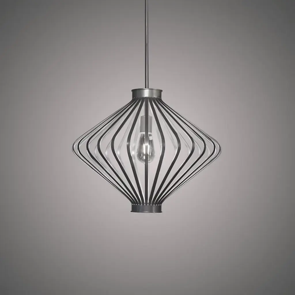 Sleek modern design and functional everyday light convene in the Vasi 20455 Pendant by Ultralights. Crafted from smooth metal, this fixture boasts a geometric shape formed from an array of slender metal bars. Expanding widely at the center, the piece takes on a distinct diamond silhouette as it forms a cage around a single bulb suspended at its center. A low-profile canopy and slender stem support the fixture, maintaining its clean-lined design.