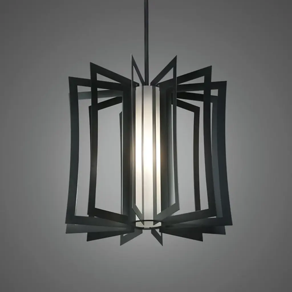 The Vasi 20460 Pendant by Ultralights offers a striking visual accent and gently diffused light perfect for modern interiors. Supported by a circular canopy and thin downrod, a cylindrical frosted shade is suspended in midair. A series of thin metal arms extend from the top of the piece and sharply turn downward and back in to create a rectangular frame around the shade. Its light is diffused throughout, providing an encompassing glow and eye-catching style.