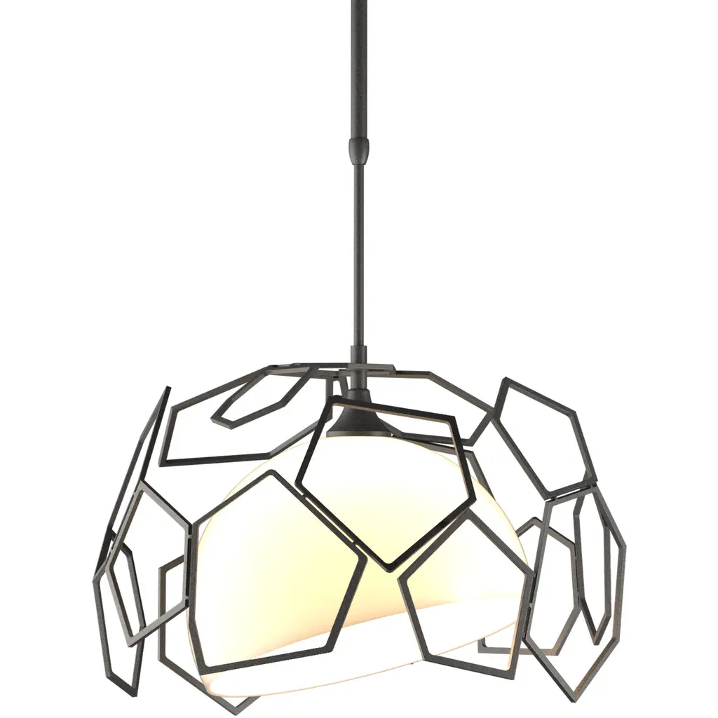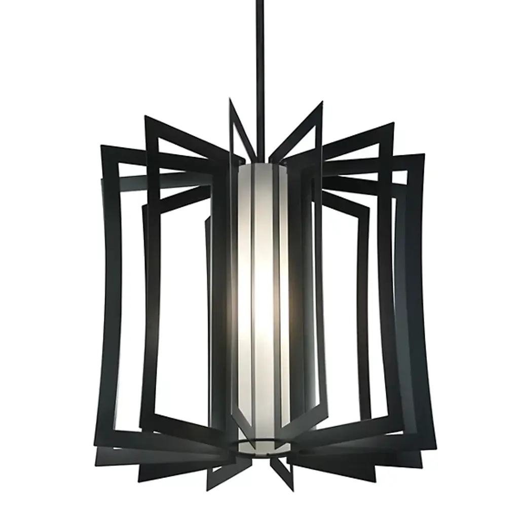 The Vasi 20460 Pendant by Ultralights offers a striking visual accent and gently diffused light perfect for modern interiors. Supported by a circular canopy and thin downrod, a cylindrical frosted shade is suspended in midair. A series of thin metal arms extend from the top of the piece and sharply turn downward and back in to create a rectangular frame around the shade. Its light is diffused throughout, providing an encompassing glow and eye-catching style.
