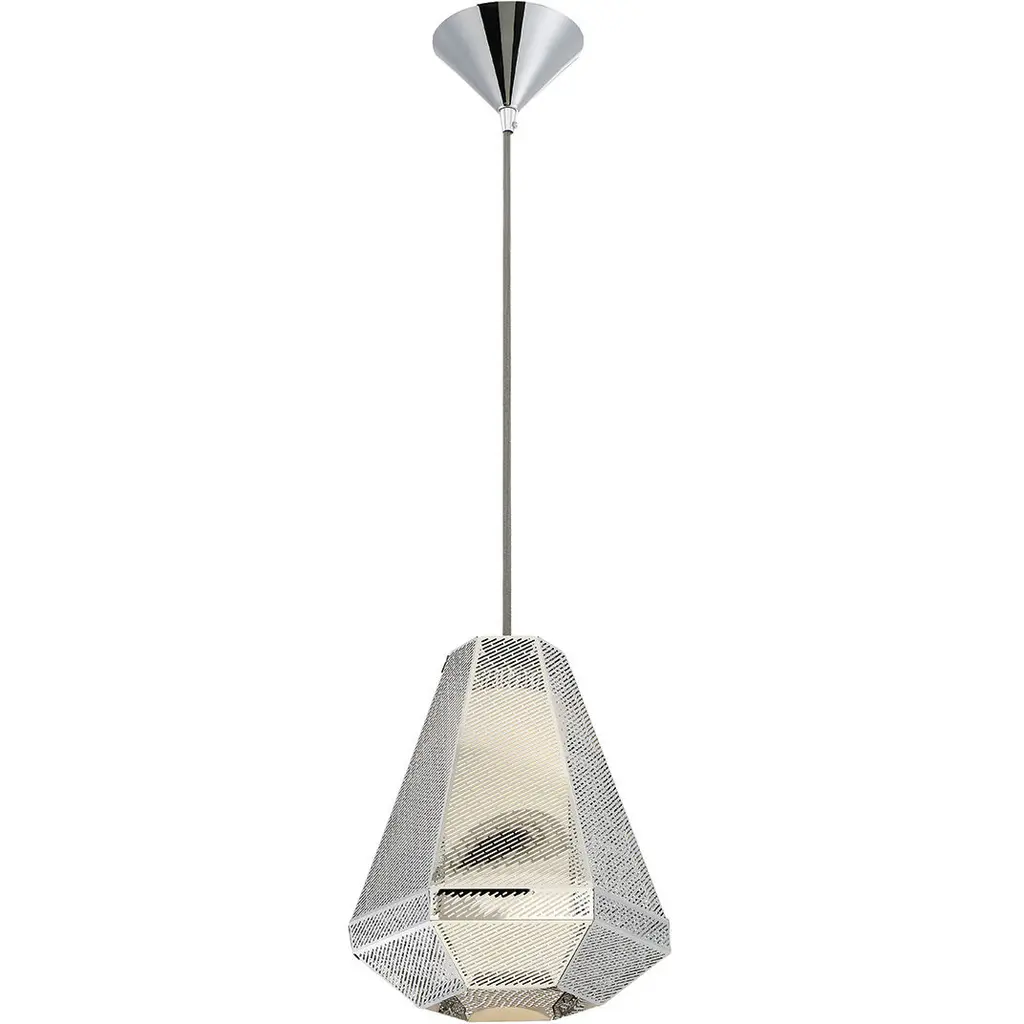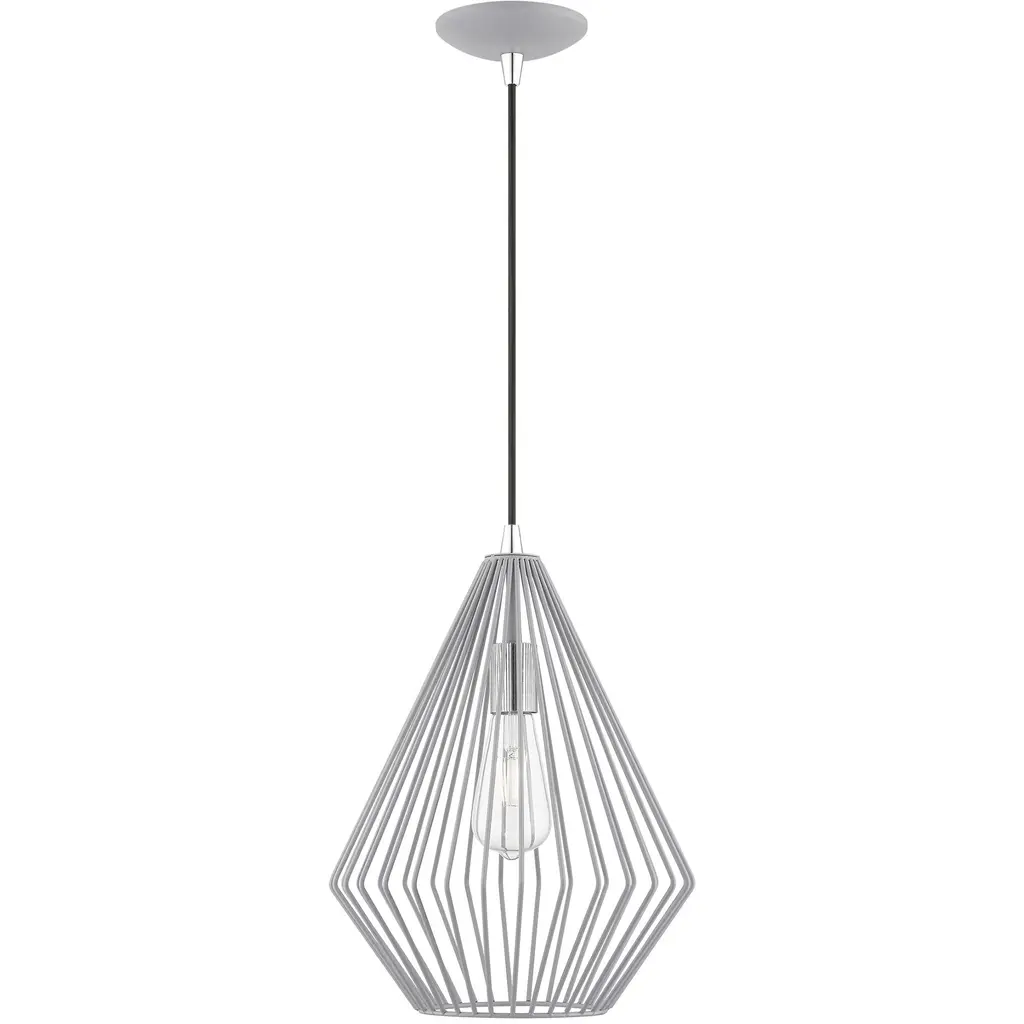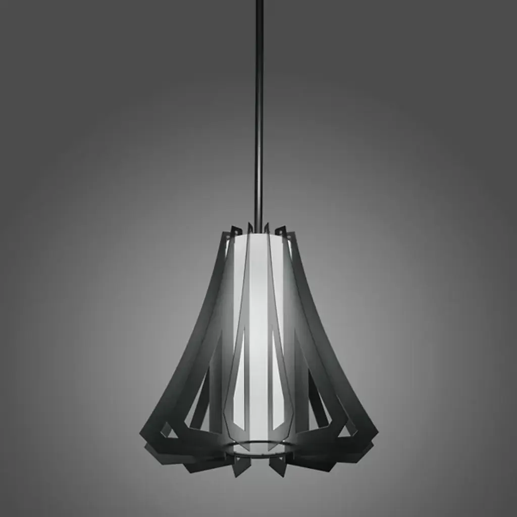 The Vasi 20462 Pendant from Ultralights combines a statement-making design and practical lighting solution. Its cylindrical frosted shade houses the fixture’s light source, suspended in place by a metal downrod and circular canopy. Flat triangular frames extend from the top of the piece to gently curve downward and widen at its end, creating a unique bell shape. Its light provides pleasant, glare-free illumination for the room while showcasing the expressive design of its framework.