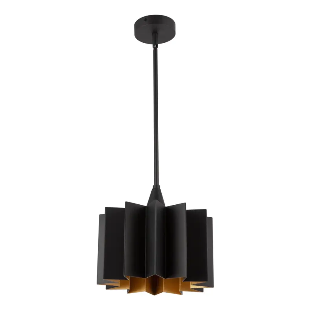 The Vasi 20462 Pendant from Ultralights combines a statement-making design and practical lighting solution. Its cylindrical frosted shade houses the fixture’s light source, suspended in place by a metal downrod and circular canopy. Flat triangular frames extend from the top of the piece to gently curve downward and widen at its end, creating a unique bell shape. Its light provides pleasant, glare-free illumination for the room while showcasing the expressive design of its framework.