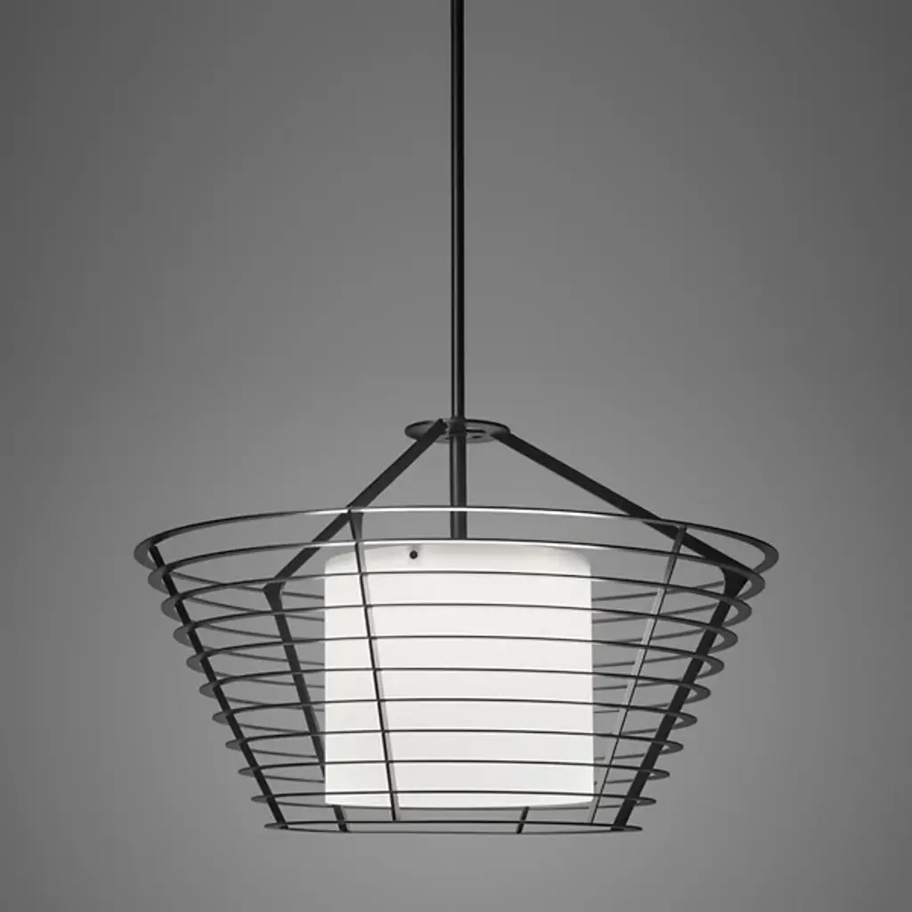 Bring a bold touch of modern design to your home’s interior décor with the addition of the Vasi 20466 Pendant by Ultralights. A disc-shaped canopy drops a thin downrod to suspend a tapered metal basket made of slender horizontal rings. Becoming smaller at they reach the end, each ring is stacked in an even distance between the next, forming a clean line pattern against the fixture’s frosted glass diffuser. Its light is held at the center of the piece, sending a balanced layer of light over its surroundings.