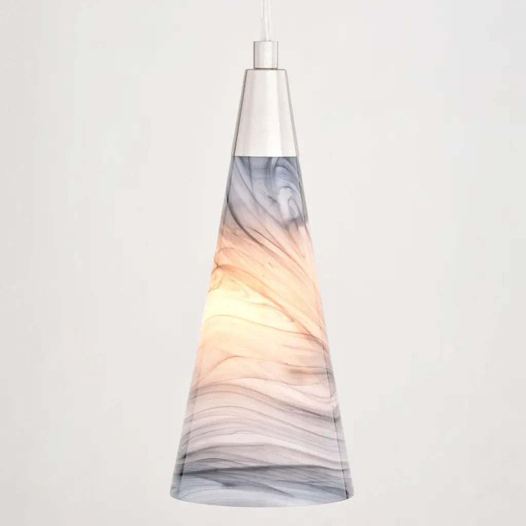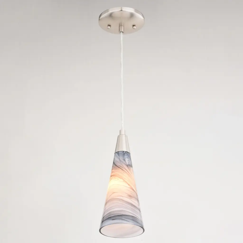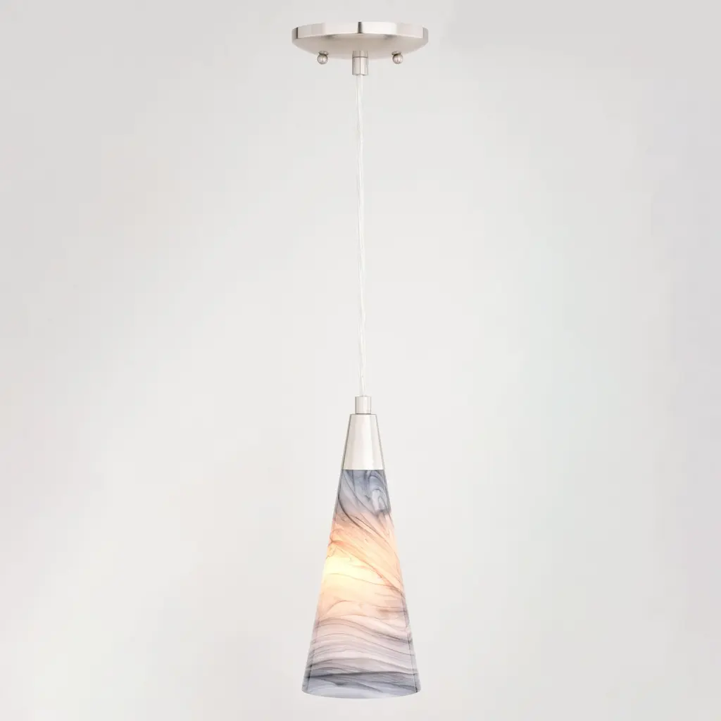The Milano collection of art glass mini pendant lights feature hand-blown glass which gracefully blend into almost any decor. Because each glass is handcrafted utilizing century-old techniques, no two pieces are identical. The marble swirl colored glass has tones of gray and silver in an updated elongated cone shape. Install this mini pendant individually or in a grouping; ideal for kitchens, dining areas, or bar areas.Features:Dimensions:Electrical Specifications: