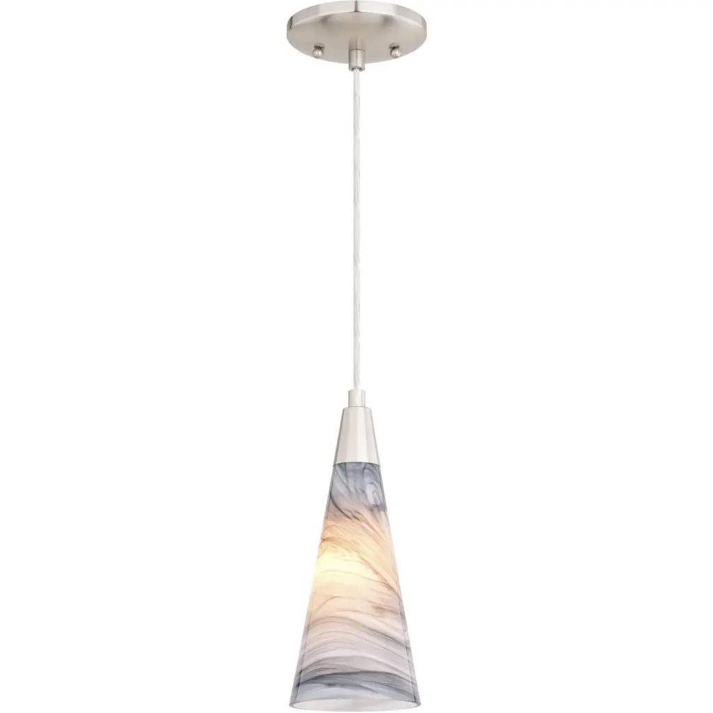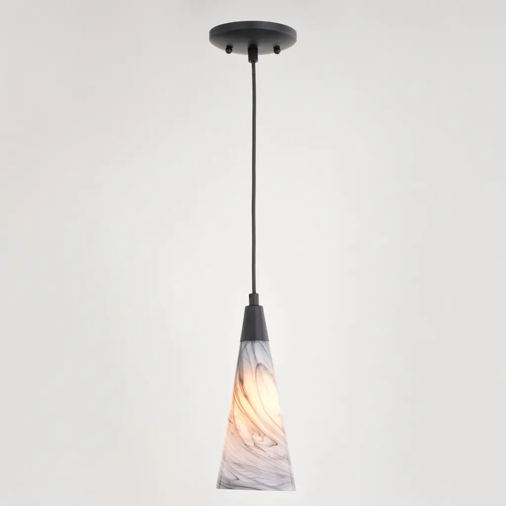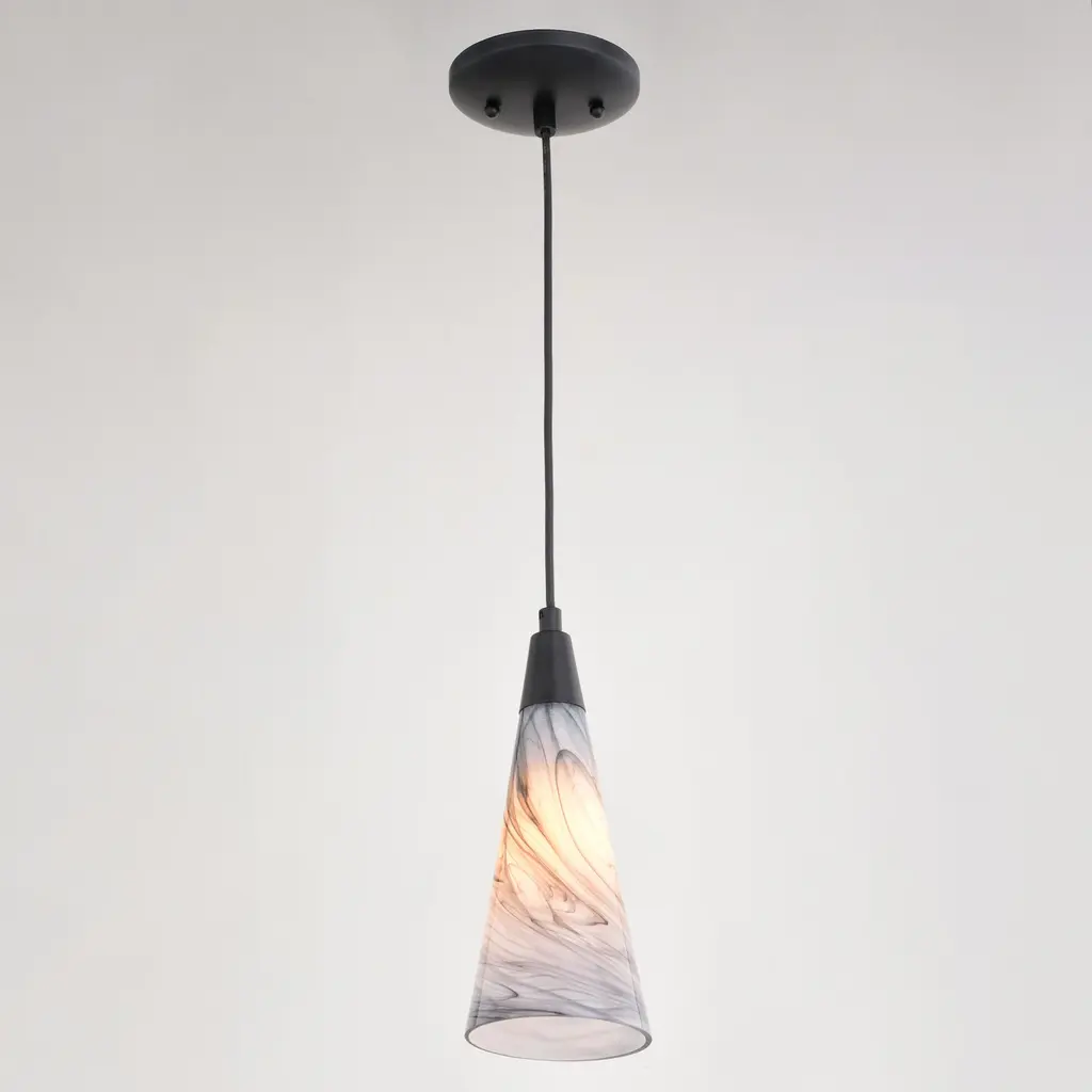 The Milano collection of art glass mini pendant lights feature hand-blown glass which gracefully blend into almost any decor. Because each glass is handcrafted utilizing century-old techniques, no two pieces are identical. The marble swirl colored glass has tones of gray and silver in an updated elongated cone shape. Install this mini pendant individually or in a grouping; ideal for kitchens, dining areas, or bar areas.Features:Dimensions:Electrical Specifications: