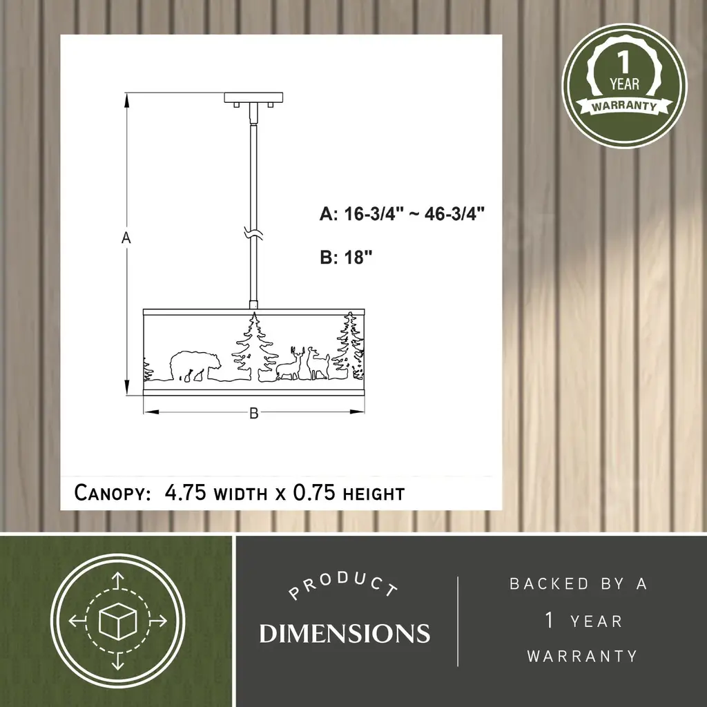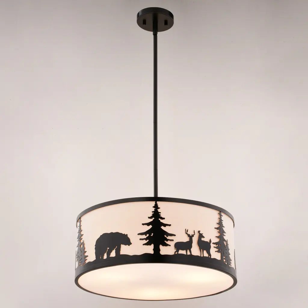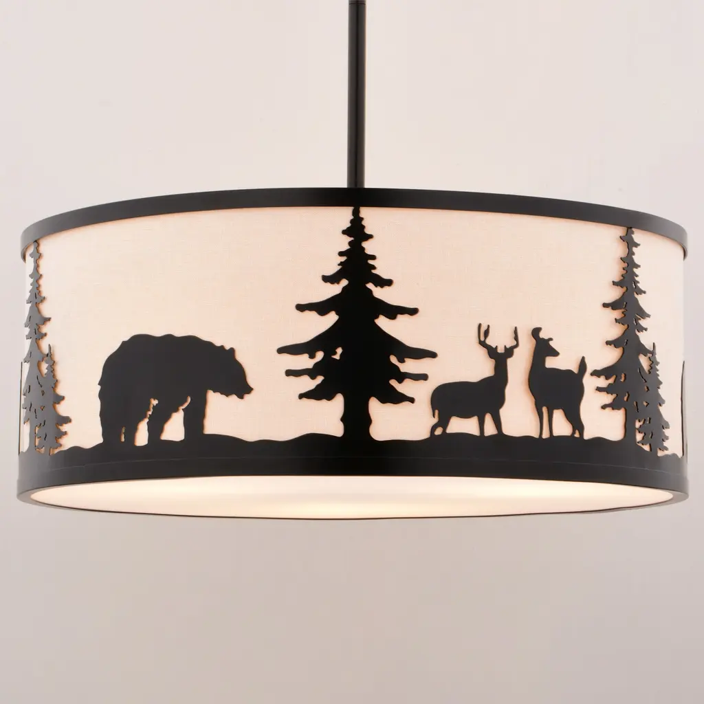 Embrace the serene whispers of the artfully crafted Acadia pendant to bring the essence of the wild into your home. The Acadia pendant's three lights and textured linen shade showcase bear and deer silhouettes set against a backdrop of evergreen trees. Perfect for kitchens or family rooms of cabins, lodges, or any home seeking to add a touch of nature and rustic ambiance.Features:Dimensions:Electrical Specifications: