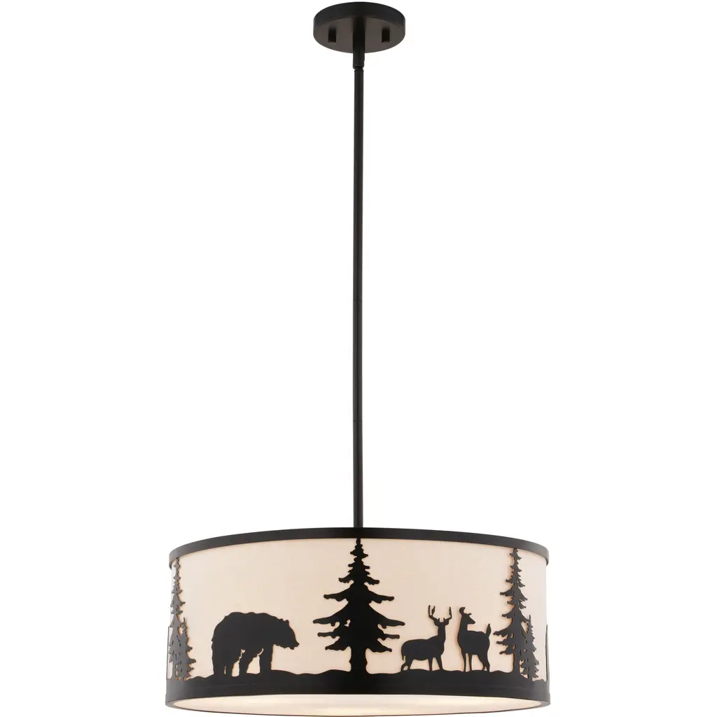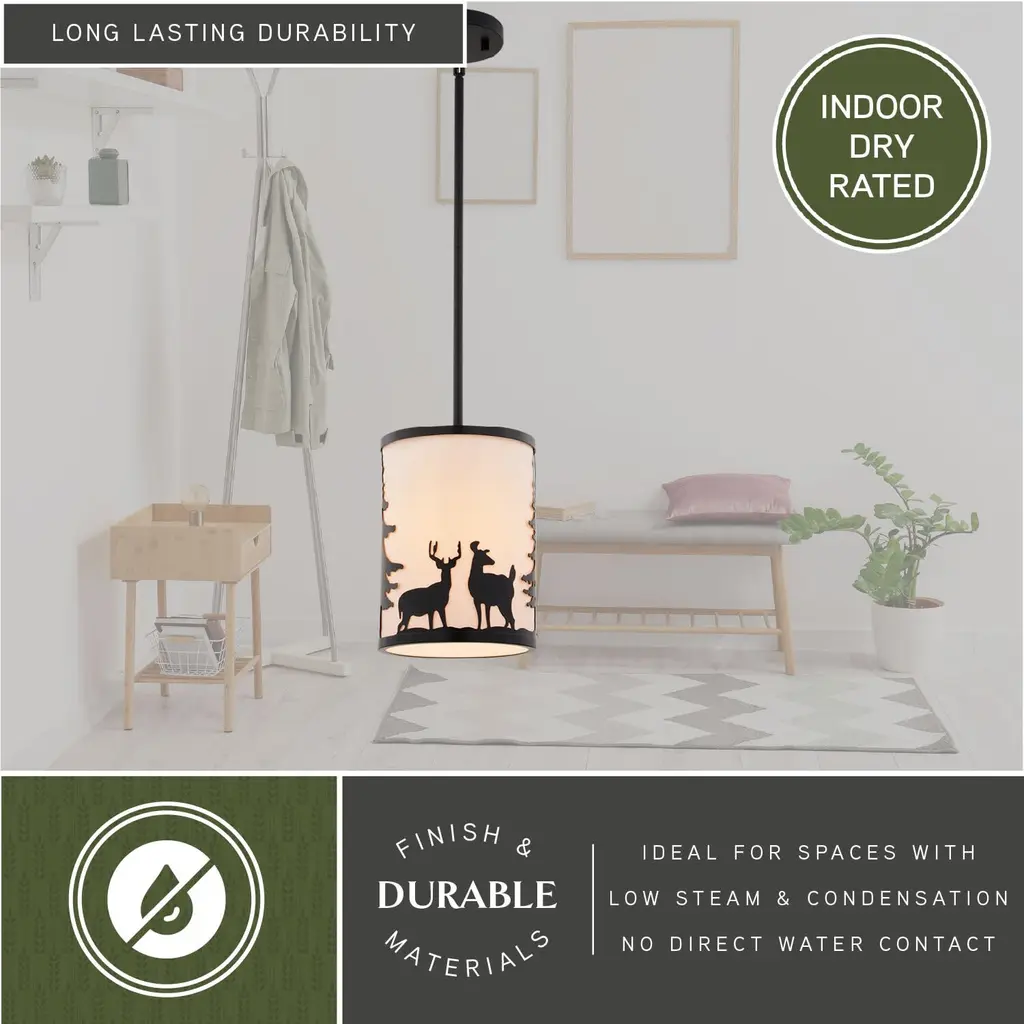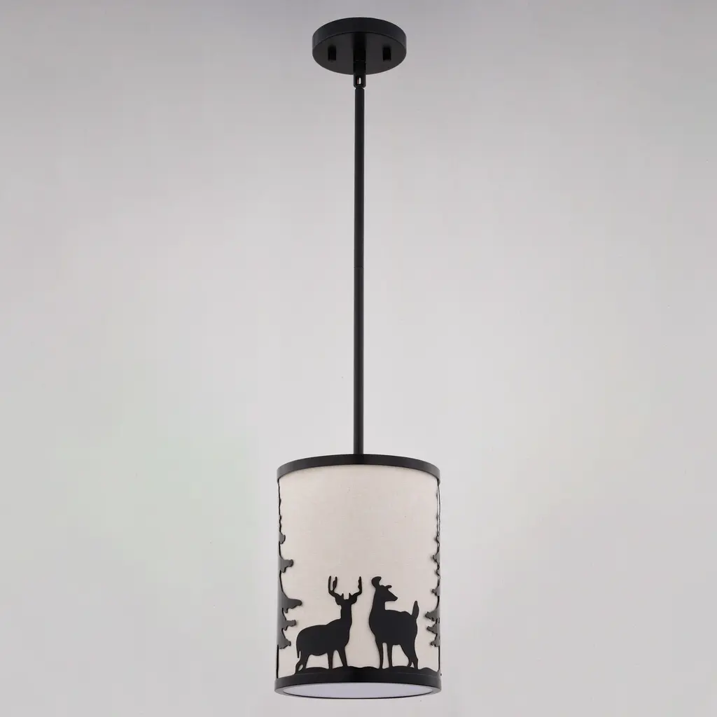 Embrace the serene whispers of the artfully crafted Acadia mini pendant to bring the essence of the wild into your home. The Acadia pendant's textured linen shade showcases bear and deer silhouettes set against a backdrop of evergreen trees. Perfect for kitchens or family rooms of cabins, lodges, or any home seeking to add a touch of nature and rustic ambiance.Features:Dimensions:Electrical Specifications: