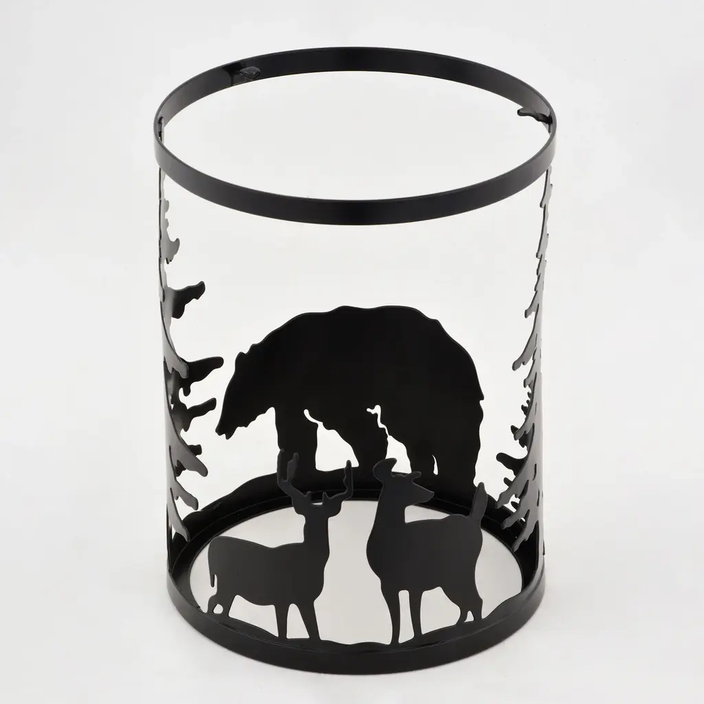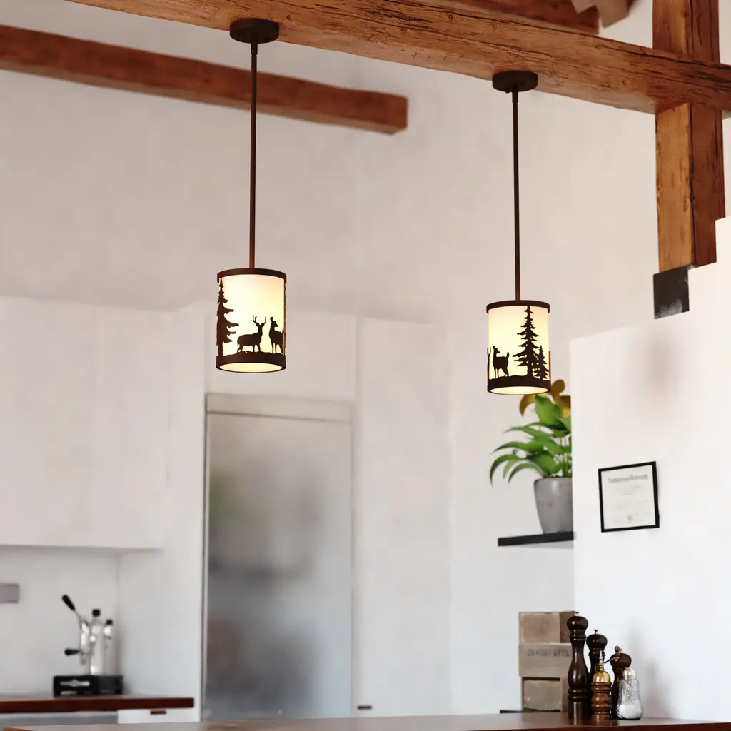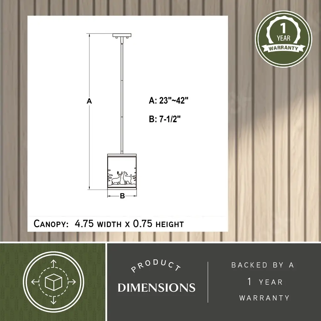 Embrace the serene whispers of the artfully crafted Acadia mini pendant to bring the essence of the wild into your home. The Acadia pendant's textured linen shade showcases bear and deer silhouettes set against a backdrop of evergreen trees. Perfect for kitchens or family rooms of cabins, lodges, or any home seeking to add a touch of nature and rustic ambiance.Features:Dimensions:Electrical Specifications: