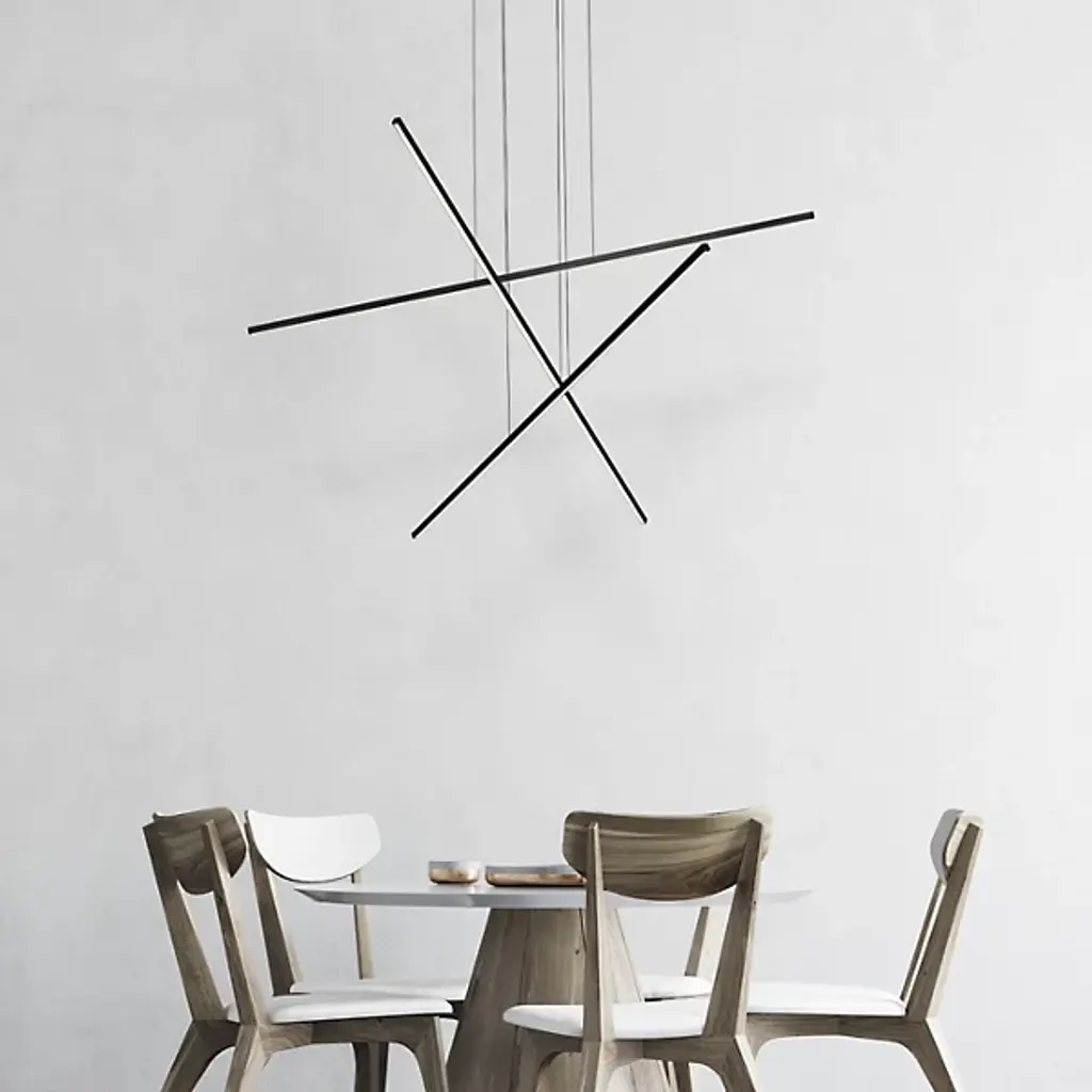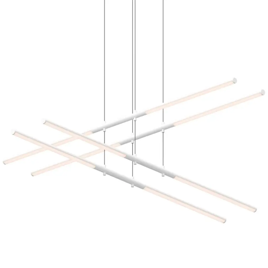 Elegant and modern. The Vega Minor LED Multi-Light Pendant by Kuzco Lighting is a sophisticated and abstract arrangement. Suspended with thin cables, sleek and square profile linear Aluminum arms create a composition that is more minimal than the fixture that inspired this piece. Inset Opal Polymeric diffusers create a beautiful layer of light, and a finely textured finish lends an elegant touch. A refined statement for entryways, dining and entertaining spaces, this multi light pendant adds a dynamic layer of light to its environment.