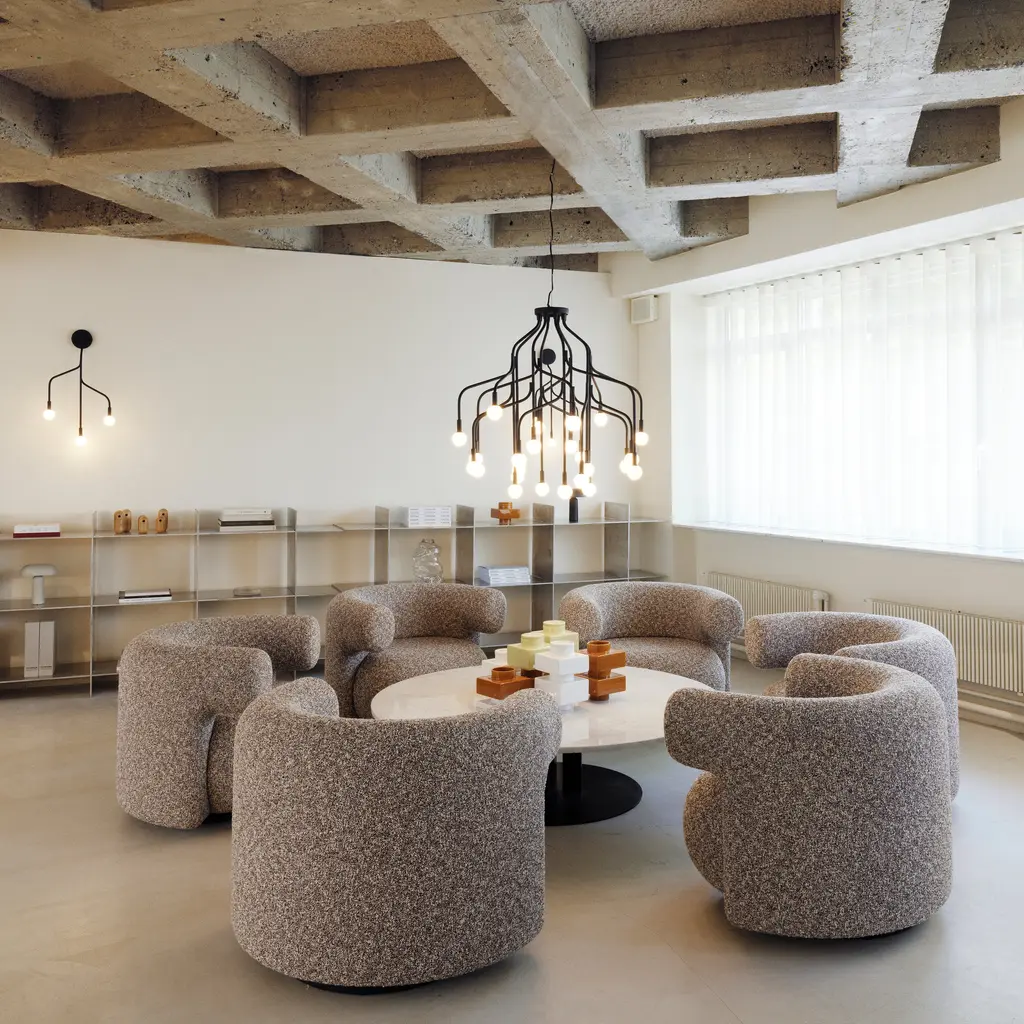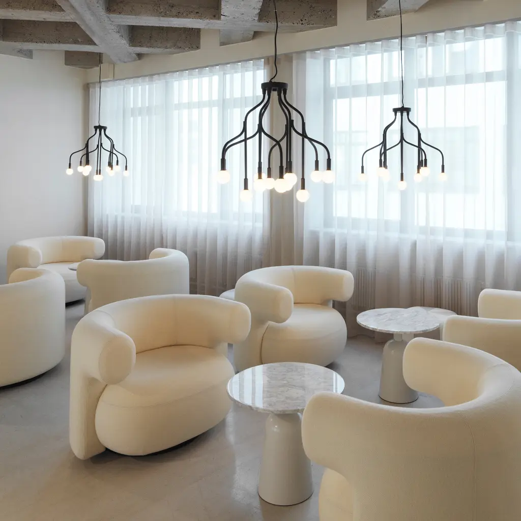 The Vekst Pendant Lamp is a sculptural design inspired by nature. Its slender, branch-like arms are crafted from powder-coated steel, each holding a bulb surrounded by a sphere of etched opal glass. This organic, tree-like lamp offers a soft, ambient light. The Vekst collection includes both pendant and wall lamp versions, all featuring dimmable LED bulbs.